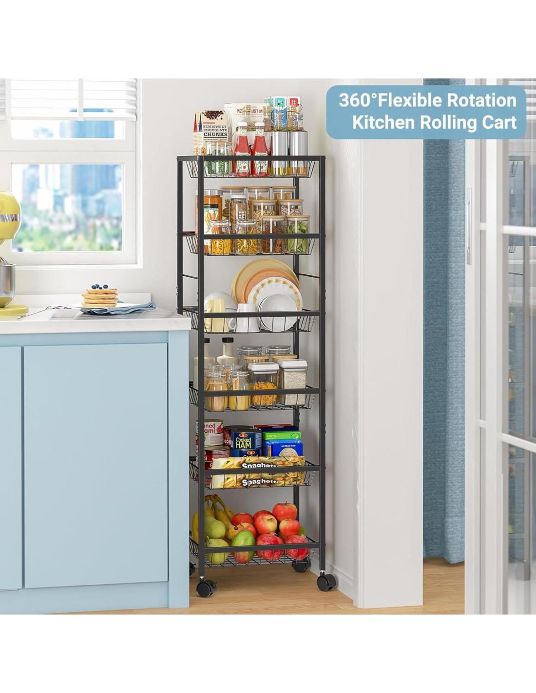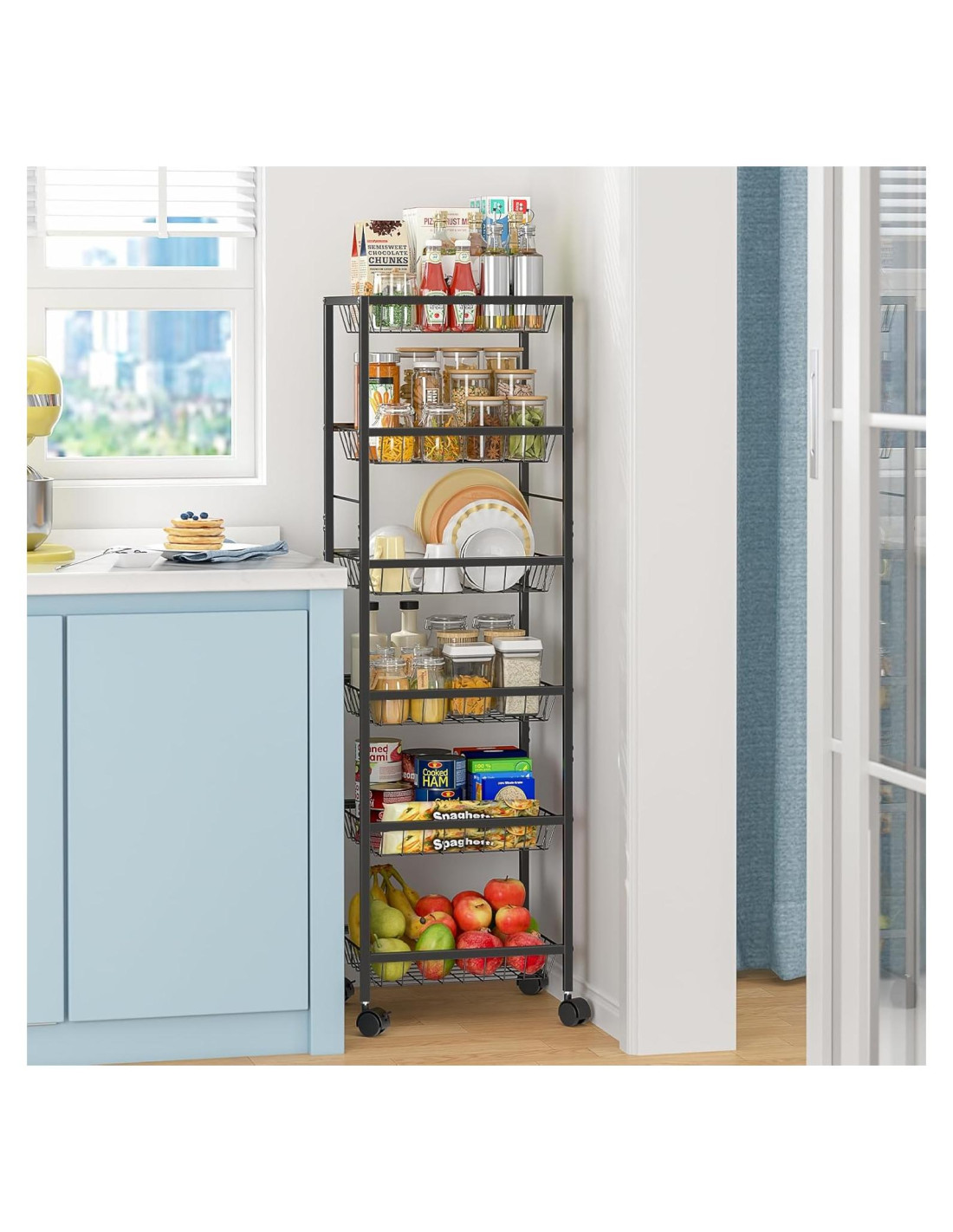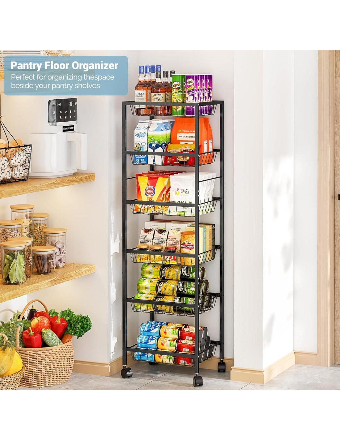 - [Super Capacidad]: Cada tamaño de cesta: 37.24 x 30.19 x 21.96 cm. ¿Buscas más espacio en tu despensa? No busques más allá de nuestro carrito de almacenamiento de despensa de uso general. Tiene mucho espacio para almacenar productos que no necesitan refrigeración como frutas, cebolla, papa, pan, bocadillos, botellas de agua, productos, latas, etc.