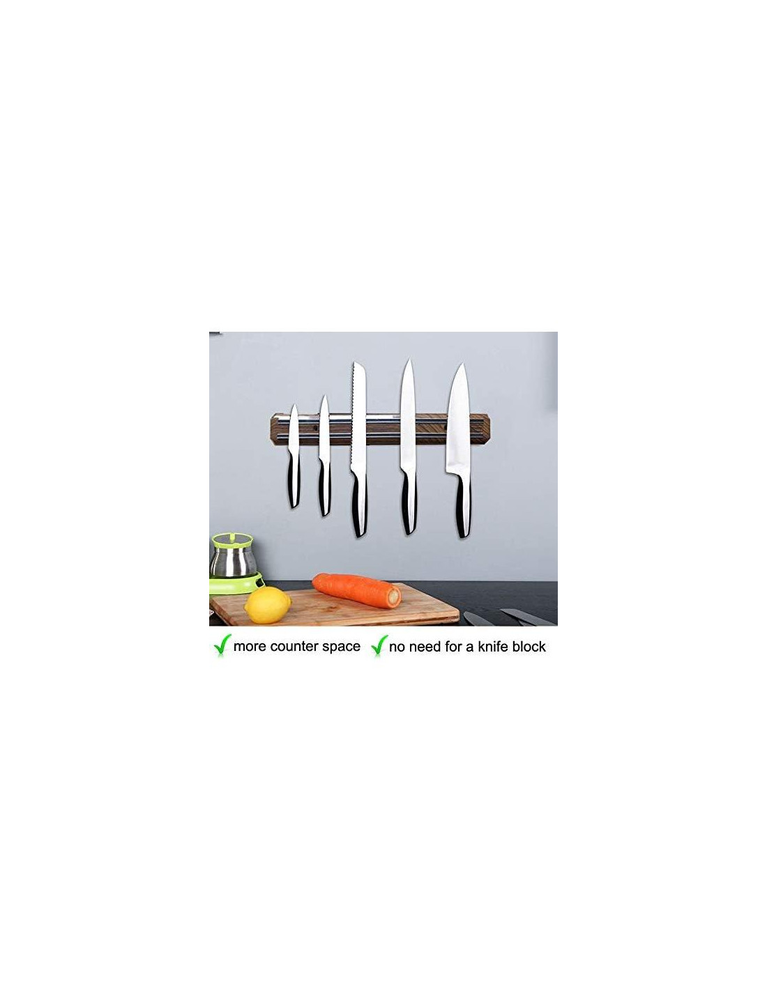 - Maravilloso soporte magnético para cuchillos: ¡Cuelga tus cuchillos en la pared, ahorrando valioso espacio en los cajones y proporcionando un acceso más conveniente a tus cuchillos! Sin fricción, mejor protección para las herramientas de corte. ¡Deshazte del voluminoso bloque de cuchillos en la encimera y organízate! Y, si estás en un espacio pequeño, como una casa rodante, cobertizo, apartamento, RV o caravana, ¡usa tu espacio vertical!