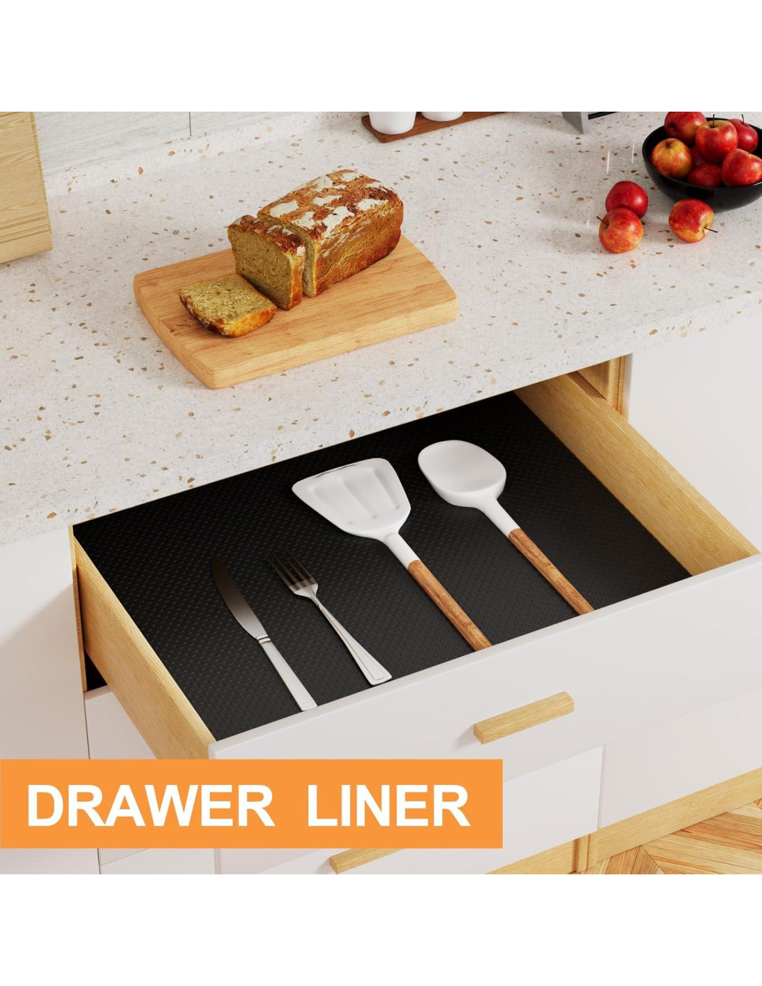 - Material seguro: el forro de gabinete de cocina está hecho de materiales EVA, que se pueden reutilizar y también entrar en contacto directo con frutas y verduras