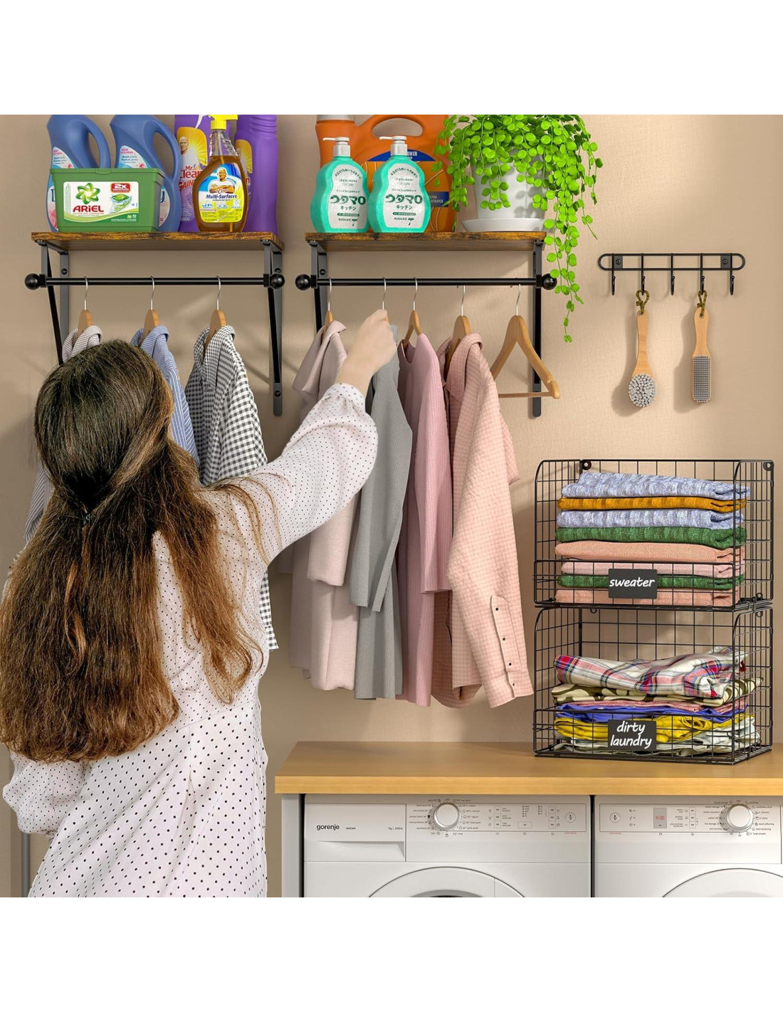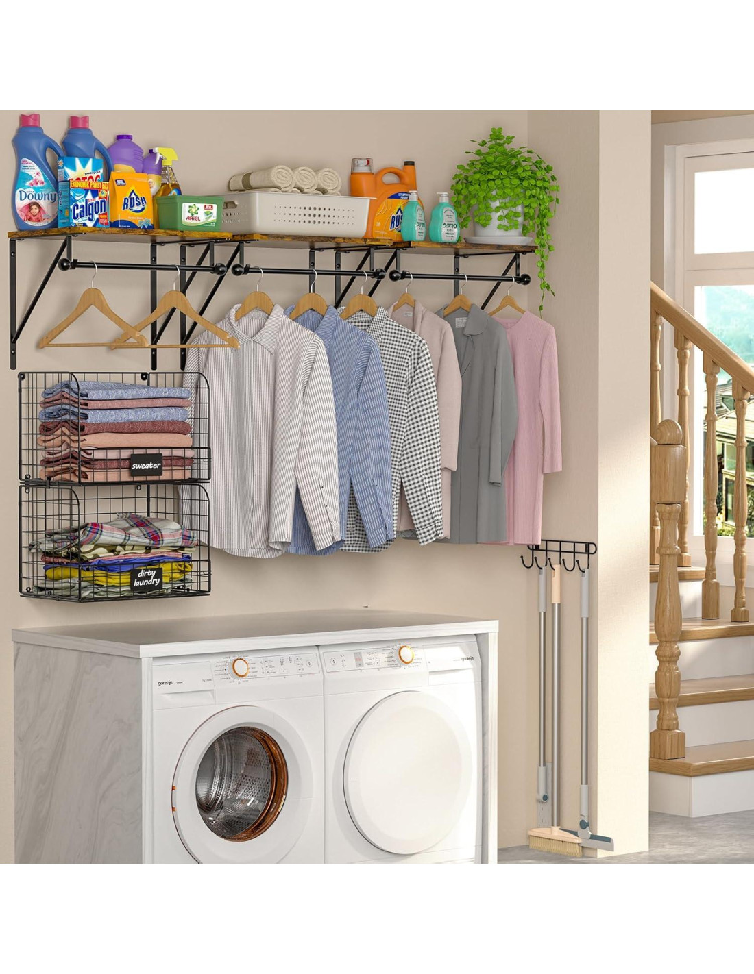 - [Gran Capacidad de Almacenamiento] Nuestros estantes de lavandería vienen con 2 estantes de pared de madera equipados con varillas para secar ropa, una fila de ganchos y 2 cestas colgantes. No solo puedes colgar ropa de manera conveniente, sino que también puedes colocar ordenadamente los suministros de lavandería. Los estantes de pared para lavandería maximizan el uso del espacio, eliminando cualquier preocupación sobre el tamaño de tu lavadora y secadora.