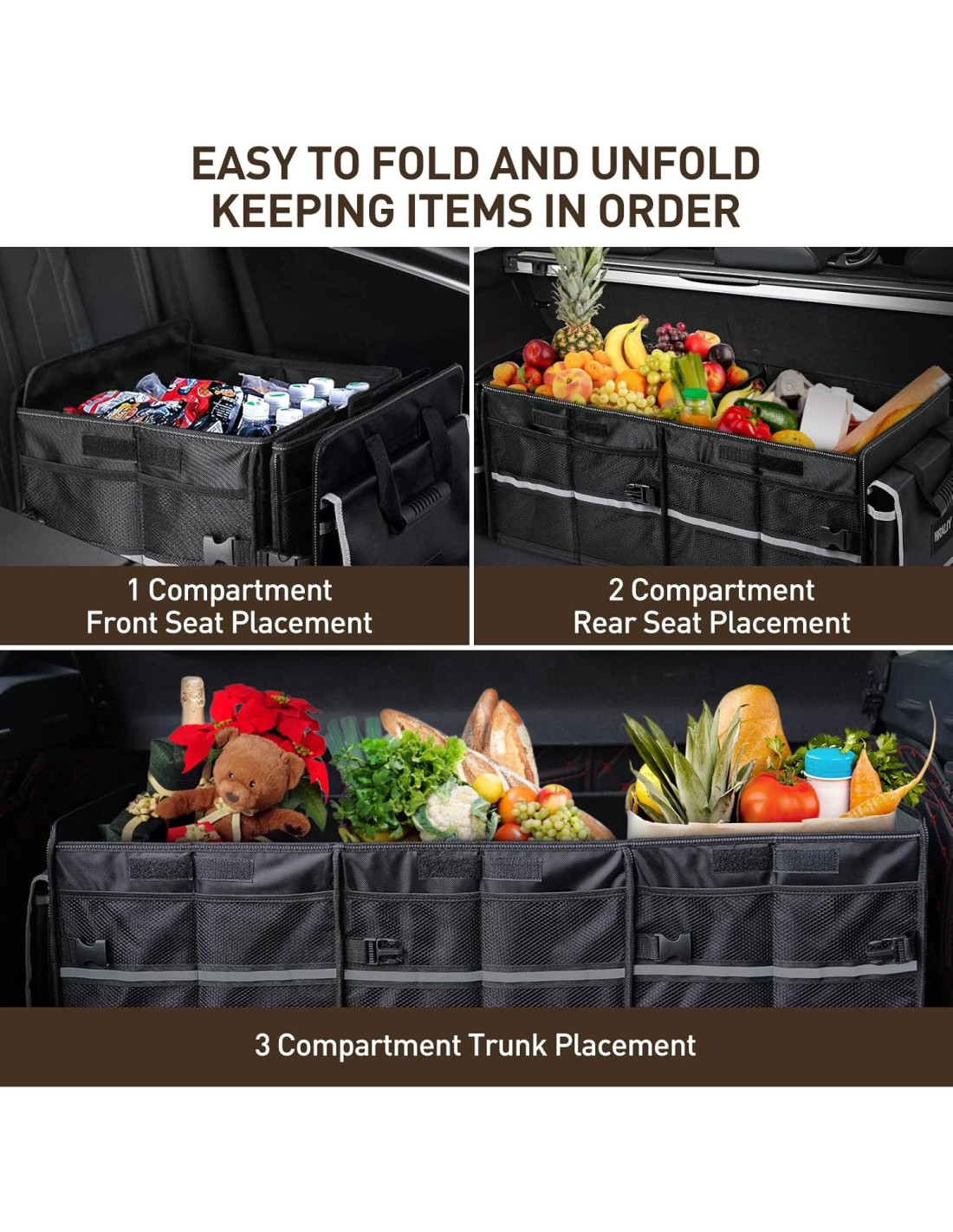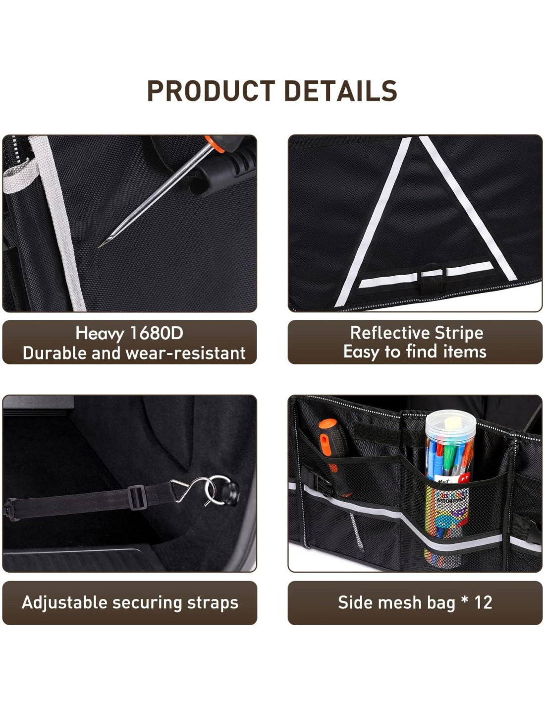 - Organizador de Maletero 4 en 1 con Bolsa Térmica: Tres compartimentos separados y una bolsa de aislamiento térmico. También tiene 12 bolsillos de malla laterales y 2 bolsillos plegables para más necesidades de almacenamiento. La bolsa de aislamiento independiente puede mantener caliente o refrigerada