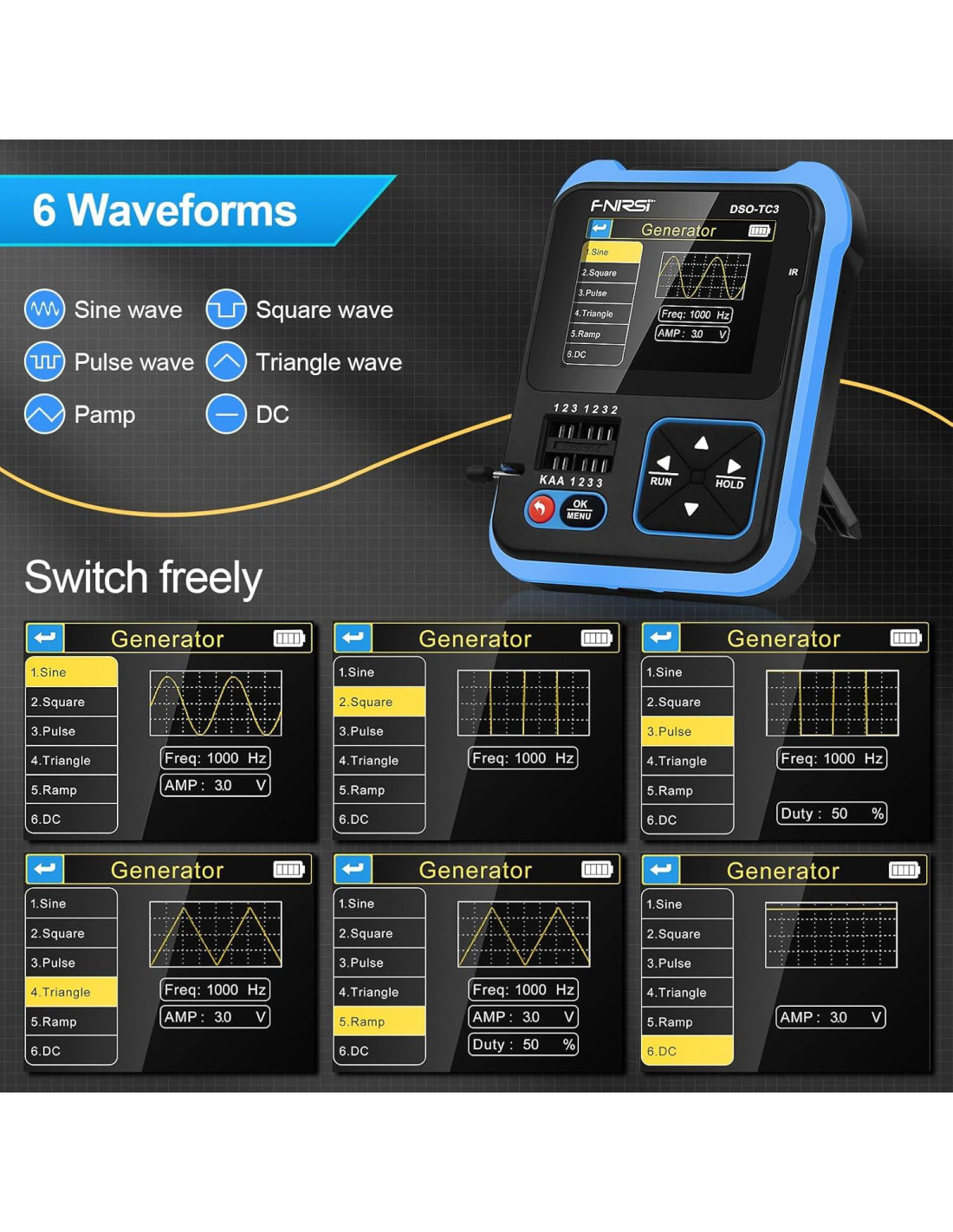 - [3 en 1 Osciloscopio Multifuncional] Este osciloscopio integra funciones como osciloscopio digital, probador de transistores, probador de componentes electrónicos, generador de señales, prueba de continuidad, medición de voltaje, medición de temperatura y humedad, decodificación infrarroja, etc.