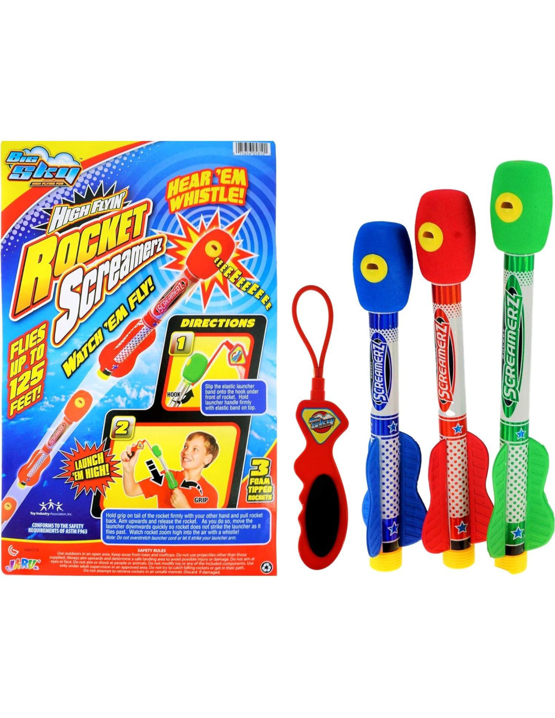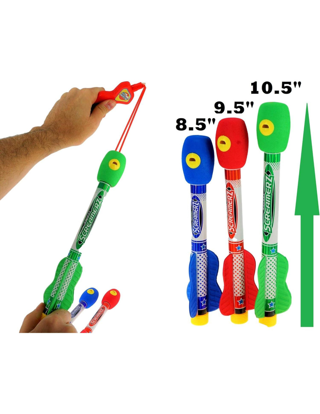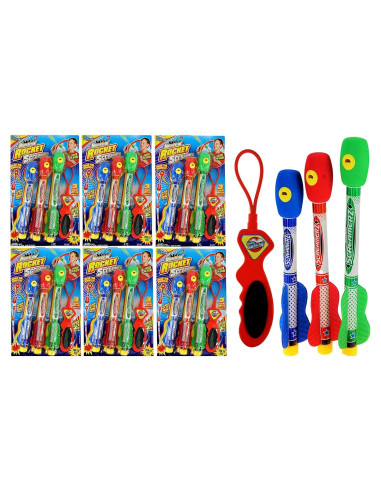 - 6 PAQUETES DE 3 COHETES CADA UNO, TOTAL 18 COHETES. de los mejores juguetes exteriores de cohetes silbadores de alto vuelo. Cada conjunto contiene 3 cohetes: Verde 26.7 cm, Rojo 24.1 cm y Azul 21.6 cm, y 1 tirachinas. Colores surtidos en Verde, Azul y Rojo.