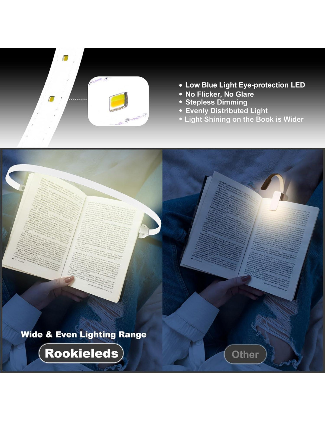 - Luz de libro de cuero sintético: Esta luz de lectura mide aproximadamente 65.99 centímetros (25.98 pulgadas) de largo, con 12 perlas LED dispuestas en una longitud de 27.94 centímetros (11 pulgadas), adecuada para libros de varios tamaños. La luz ilumina un área más amplia del libro sin molestar a los demás.