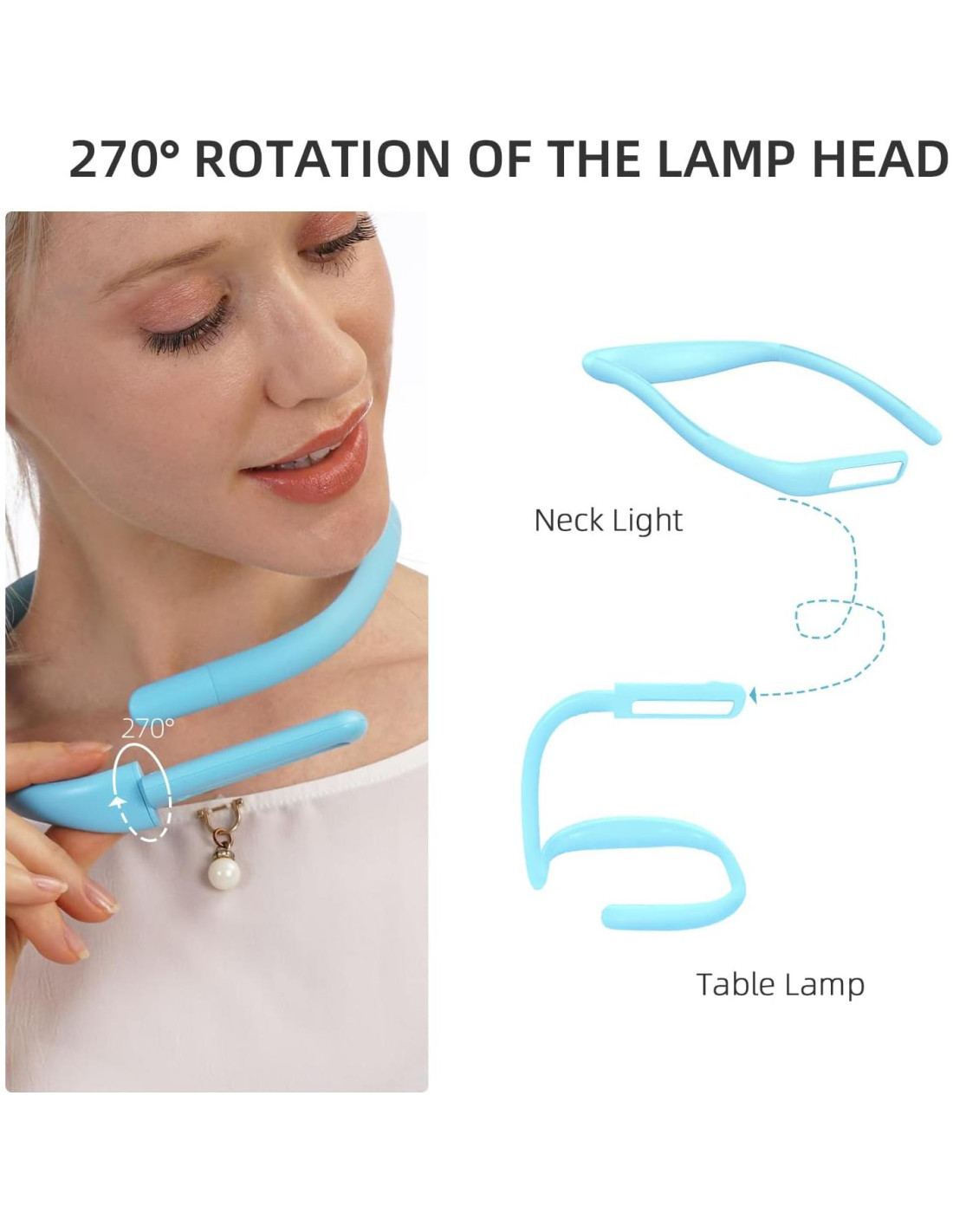 - [CABEZAL DE LÁMPARA ROTATIVO 270] La cabeza de luz de esta lámpara de lectura para colgar en el cuello se puede rotar 270 grados. Cuando la cuelgas en tu cuello o la pones en la mesa como lámpara de escritorio, puedes cambiar el ángulo de la luz ajustando la posición de la cabeza de la lámpara. Simple, rápido y satisface tus necesidades diarias.