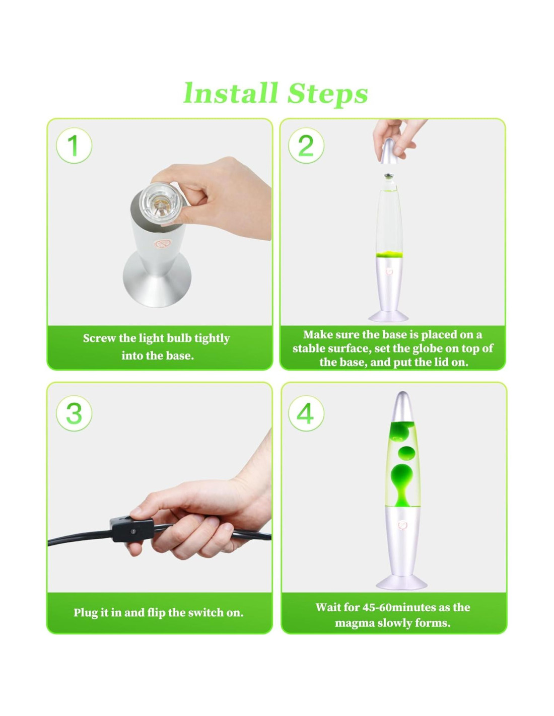 - Experiencia de Iluminación Relajante y Calmante: Las lámparas de magma verde no solo sirven para un propósito decorativo, sino que también proporcionan un ambiente de iluminación suave para aliviar el estrés diario. Ya sea en el dormitorio o en la oficina, puede añadir una atmósfera cálida a la habitación