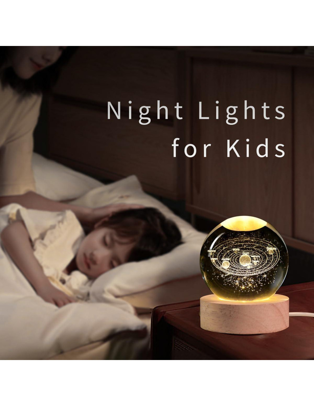 - Luz Nocturna de Esfera de Cristal - Incluye una base de madera LED que cuenta con un cable USB con interruptor de encendido/apagado para alimentarse a través de computadora, adaptador o cargador portátil. Cuando está alimentada, la esfera de cristal se transforma en una suave luz nocturna, proyectando anillos de luz soñadores en los techos.