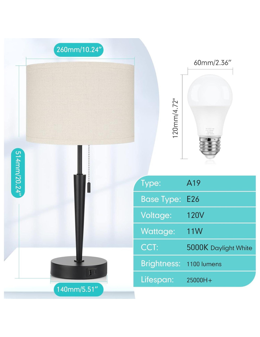 - Bombillas LED de Ahorro de Energía Incluidas: No es necesario comprar bombillas por separado. Para combinar perfectamente con la exquisita lámpara de mesita, estamos equipados con dos bombillas LED A19 de 11W gratuitas, equivalentes a bombillas incandescentes de 100W pero ahorrando hasta un 90% en tu factura de energía. 1100 lúmenes y luz blanca diurna de 5000K combinan con la pantalla de tela de lino no solo para proporcionar una iluminación brillante y suave, sino también para hacer que la lámpara sea más exquisita.