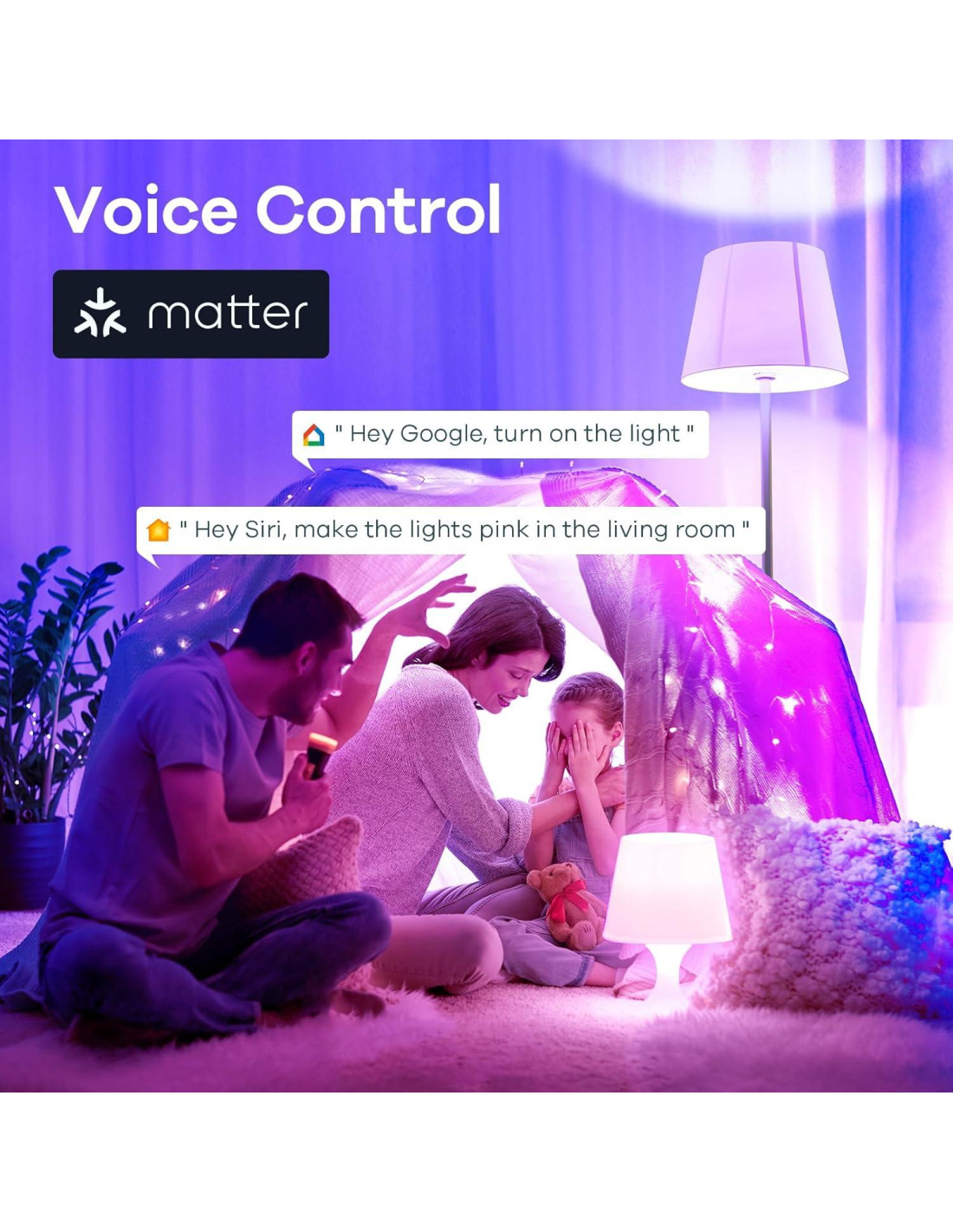 - [Control por Voz y en Grupo] Puedes controlar las bombillas LED E26 con comandos de voz, y usar cualquier aplicación Matter / la aplicación Aidot de Linkind para cambiar colores en cualquier momento. Agrega fácilmente múltiples bombillas LED que se pueden controlar juntas al mismo tiempo (por favor, usa un WiFi estable de 2.4 GHz).