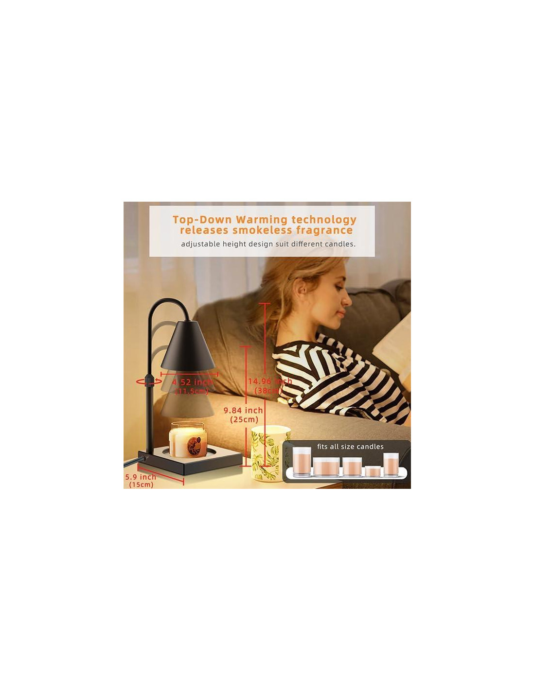 - [Diseño de Altura Ajustable] La altura del poste de la lámpara calentadora de velas se puede ajustar libremente para adaptarse a todos los tamaños de tus velas en tarro. Cuanto más cerca esté la bombilla de la vela, más caliente se vuelve, ya que diferentes alturas también pueden controlar la temperatura de calentamiento de la vela. Material de metal diseñado para durar mucho tiempo, por lo que podemos disfrutar de la fragancia de nuestras velas aromáticas favoritas durante años.