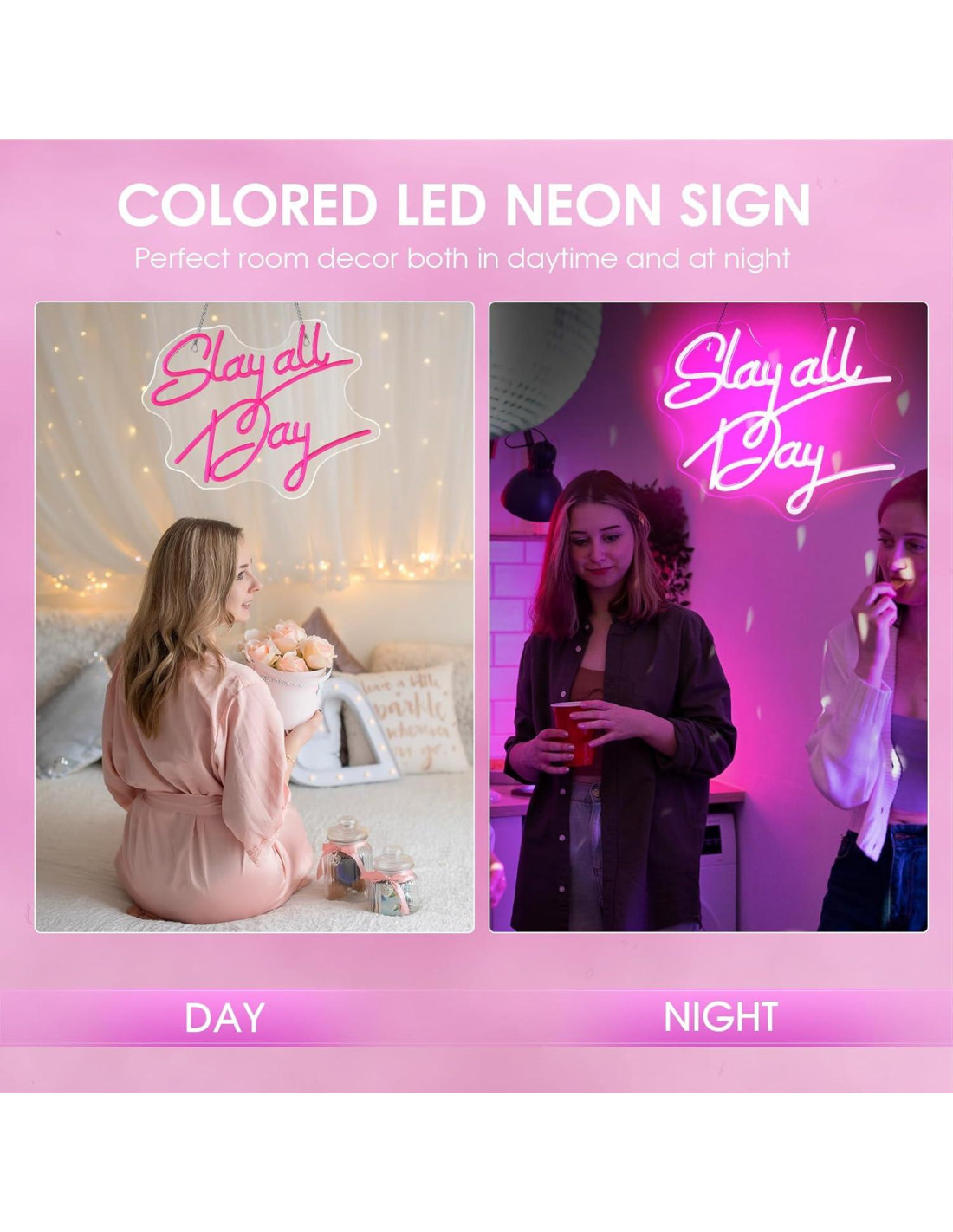 - Estilo Preppy Estético: La luz de neón Slay All Day de ReyeeInc ofrece el brillo rosa perfecto y la estética para tu espacio. Este letrero de neón rosa es una gran adición para un dormitorio universitario o el apartamento de una joven, también se ve adorable para la habitación de chicas adolescentes preppy, habitación coquette, habitación grunge, habitación Y2K, decoración femenina del centro, recordándote que sigas brillando en todo momento.