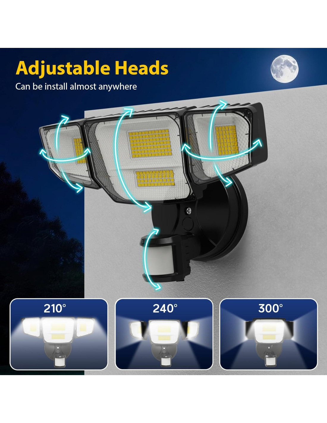 - Diseño Mejorado de 4 Cabezas: En comparación con otras luces de inundación, este diseño de 4 cabezas y 4 superficies emisoras de luz únicas proporciona un área de iluminación más uniforme y amplia. Cada cabeza de la luz de inundación se puede ajustar flexiblemente a diferentes ángulos según sea necesario, con un ángulo máximo de iluminación de 300.