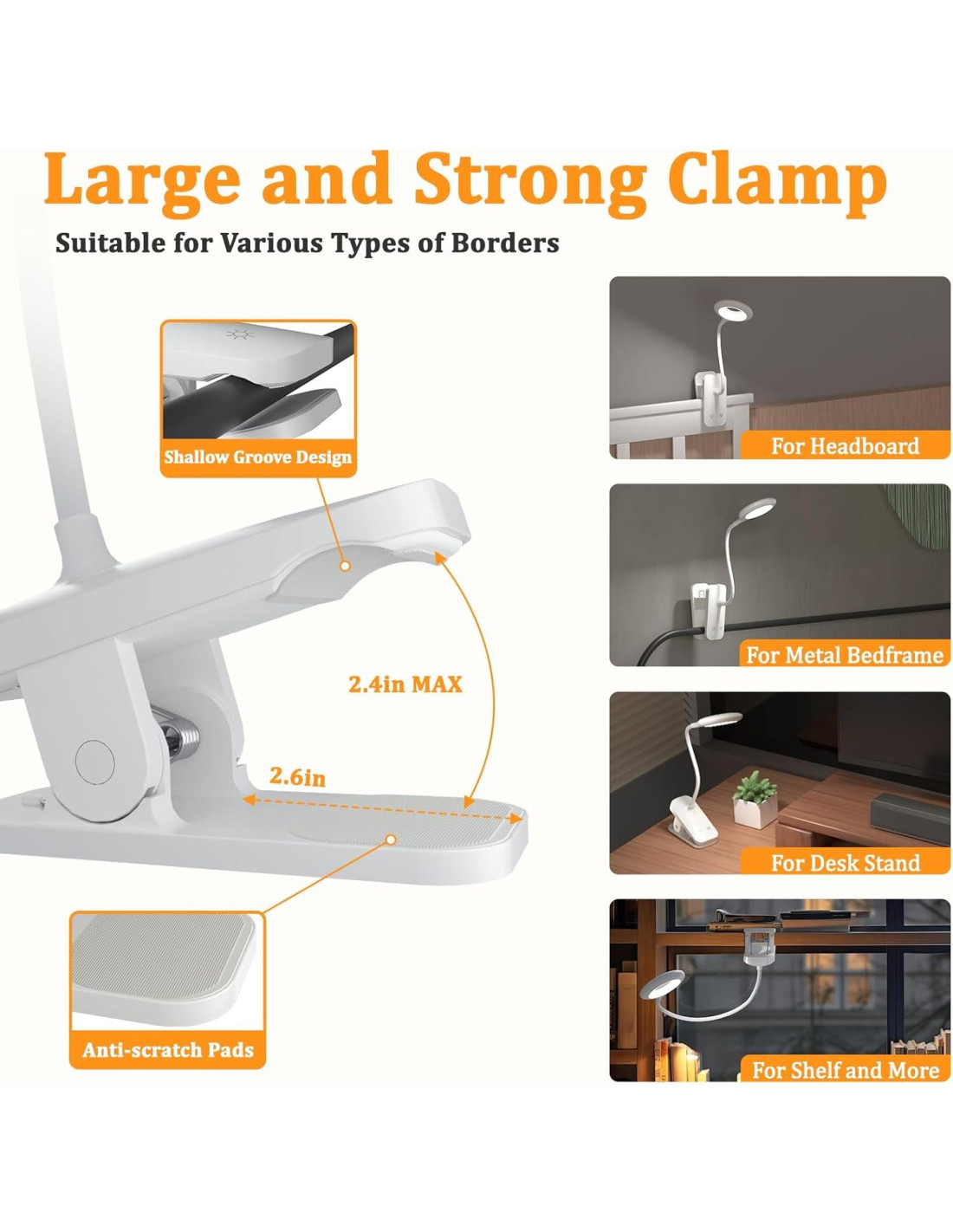 - Luz con pinza fuerte y cuello flexible - La lámpara de lectura cuenta con una pinza grande y resistente con almohadilla de silicona, que sujeta de forma segura superficies de hasta 6.1 centímetros de grosor y las mantiene libres de rasguños. Se puede adjuntar fácilmente a cabeceros, escritorios, estantes, mesas auxiliares o atriles. La forma curva interna de la pinza se adapta perfectamente a los marcos de cama de metal. Su cuello de ganso ajustable de 360 puede doblarse y girar a la posición deseada, brindándote mucha luz