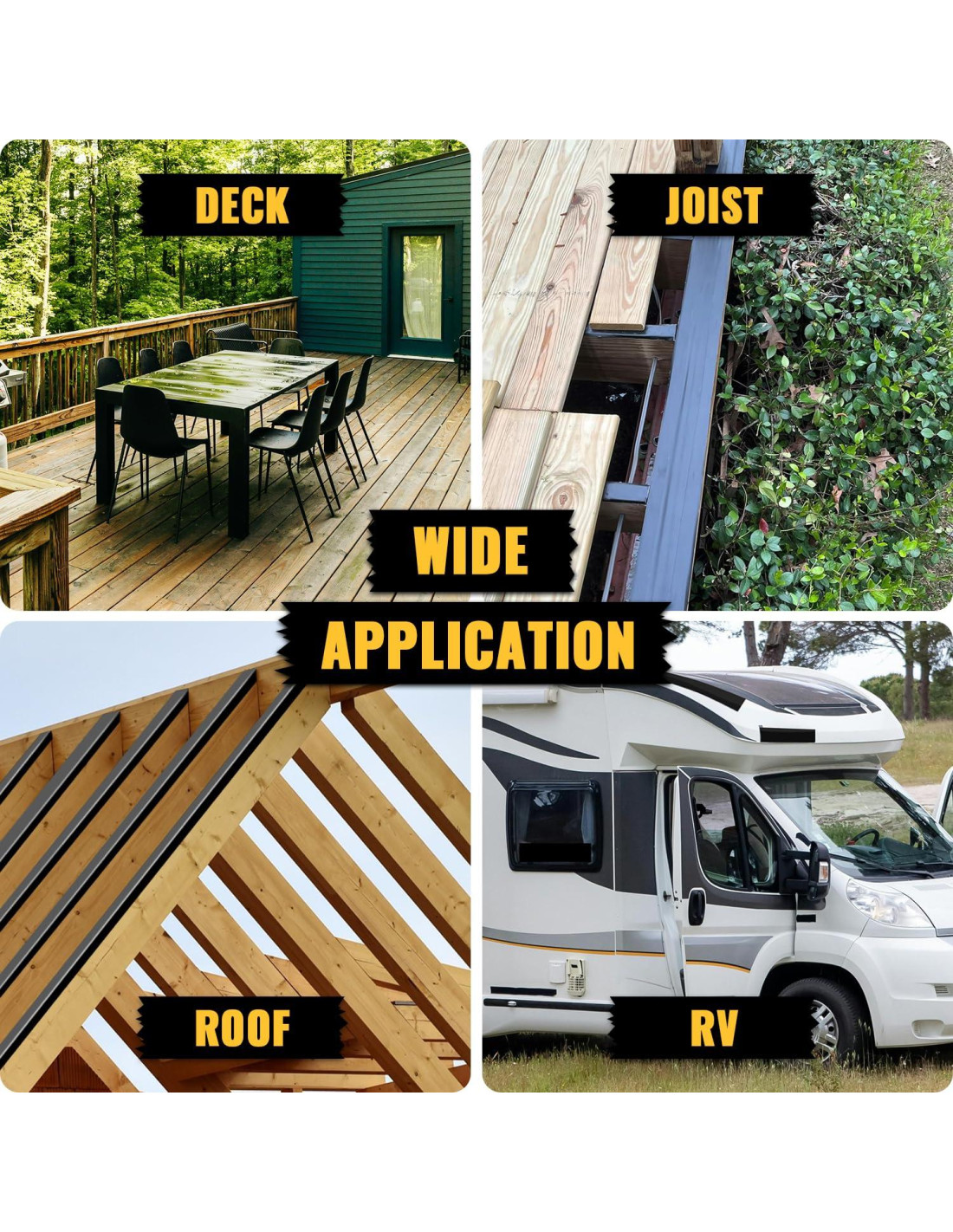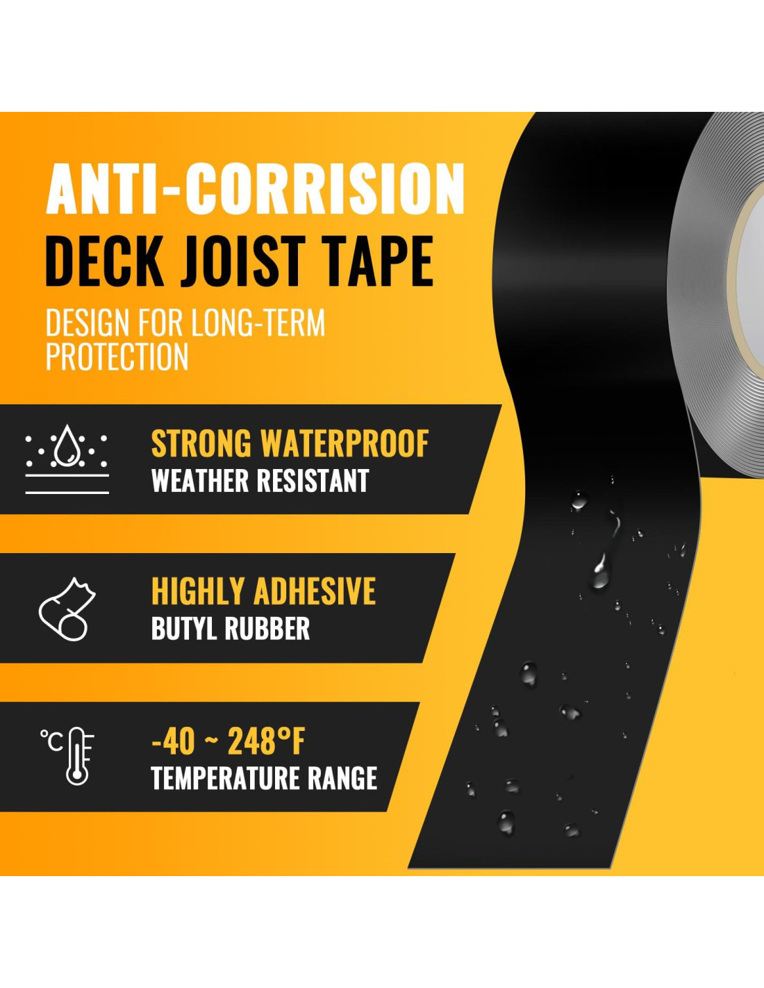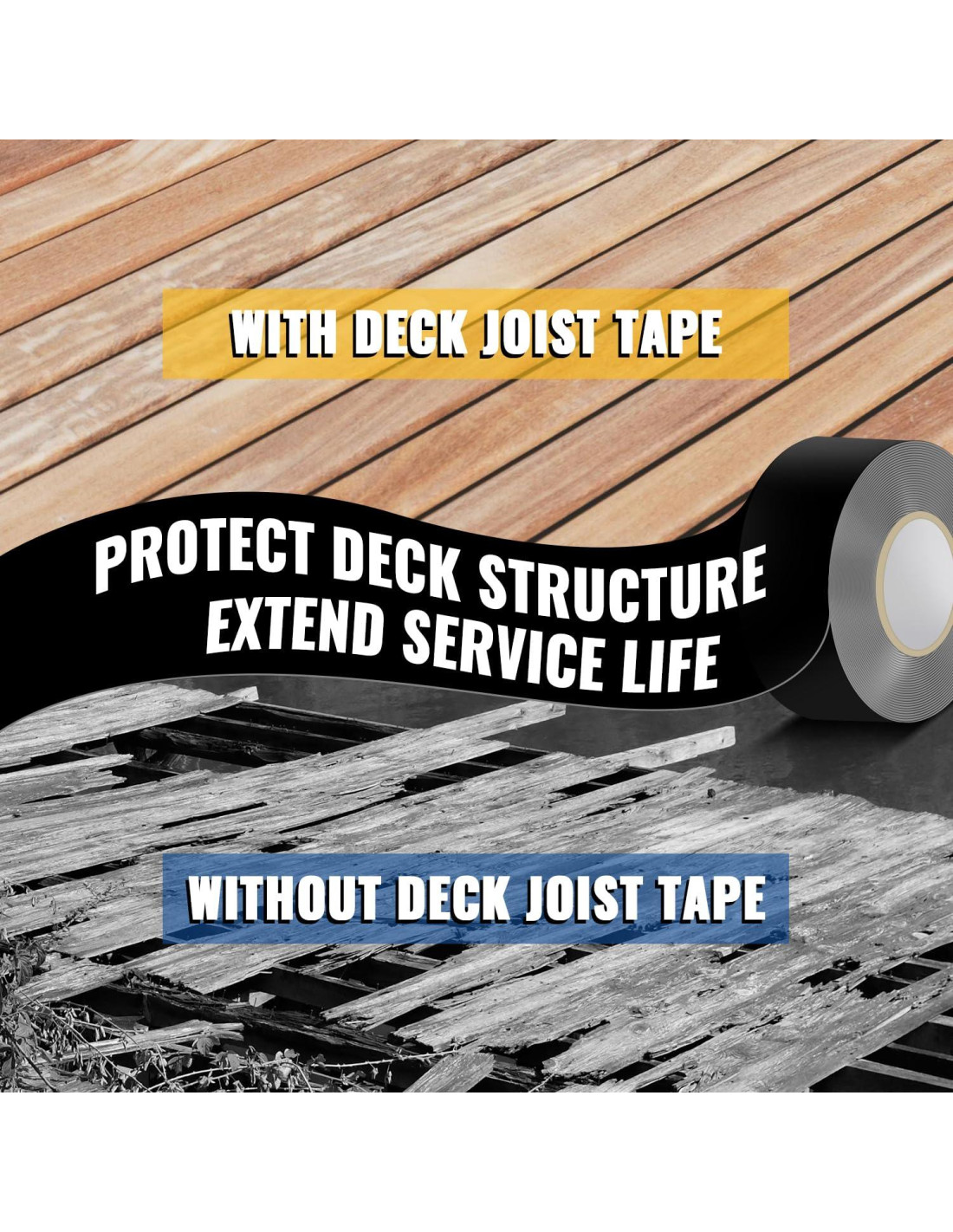 - IMPERMEABLE Y ANTI-CORROSIÓN La cinta para vigas impermeable, resistente a la intemperie y a la corrosión para decking no se romperá ni deformará fácilmente. La cinta de deck butílica impermeable puede proporcionar una barrera entre el material del decking y el ambiente exterior, previniendo en gran medida la pudrición de su madera.