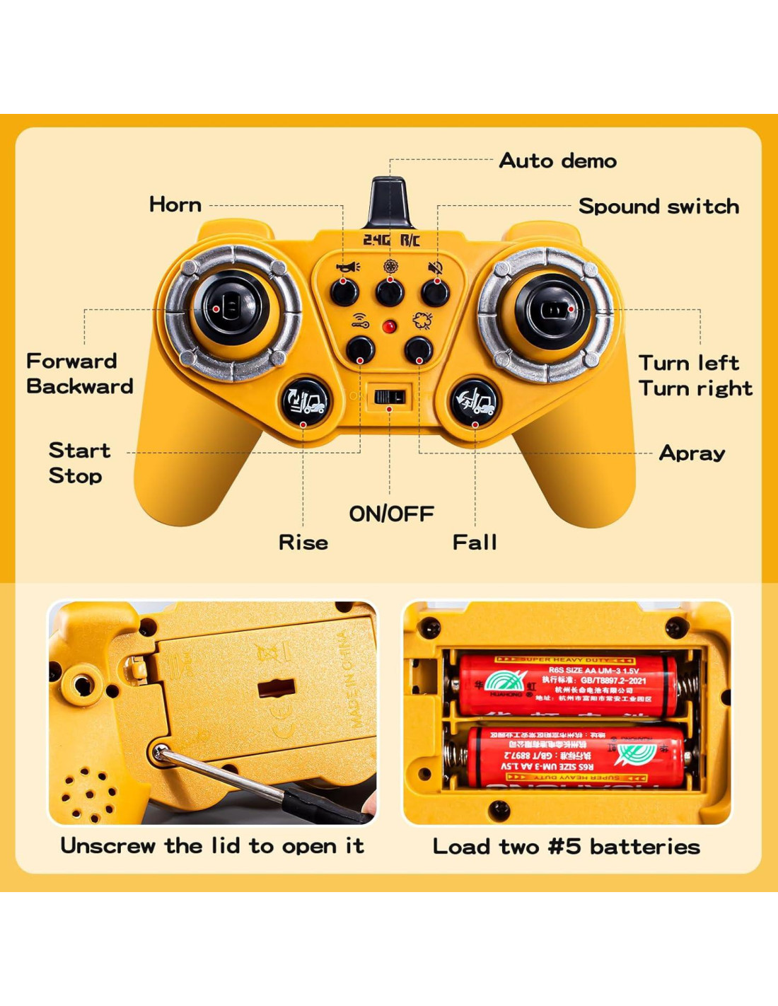 - 11 Canales Función Completa: este juguete de carretilla elevadora puede subir/bajar, avanzar/reversa, girar a la izquierda/derecha, luces en el techo, sonido y spray. Tiene un botón de demostración automática para ayudar a los niños, especialmente a los preescolares, a aprender a operar. Funciona y se comporta como una carretilla elevadora realista.