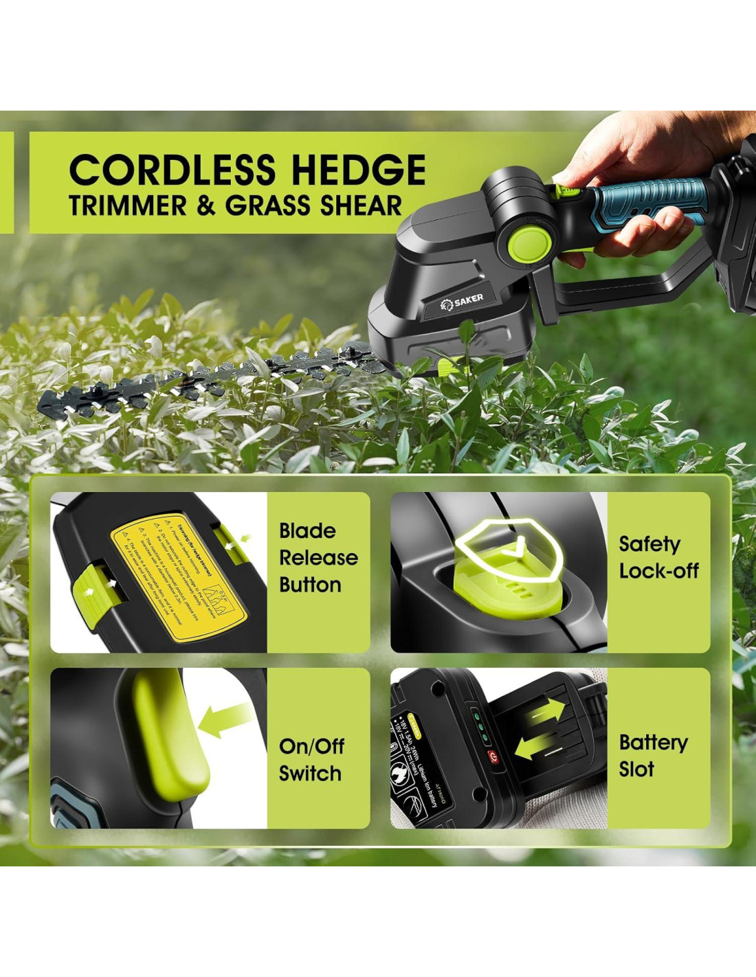 - AVISO Saker cortadora de setos inalámbrica de 20v es fácil de usar y no requiere cables ni gasolina. LA HOJA LARGA ES PARA CORTAR BROTES FINOS EN SETOS, ARBUSTOS, ÁRBOLES PEQUEÑOS Y ORNAMENTALES. LA HOJA CORTA ES PARA CORTAR CÉSPED, MALAS HIERBAS Y SECCIONES PEQUEÑAS DE CÉSPED.