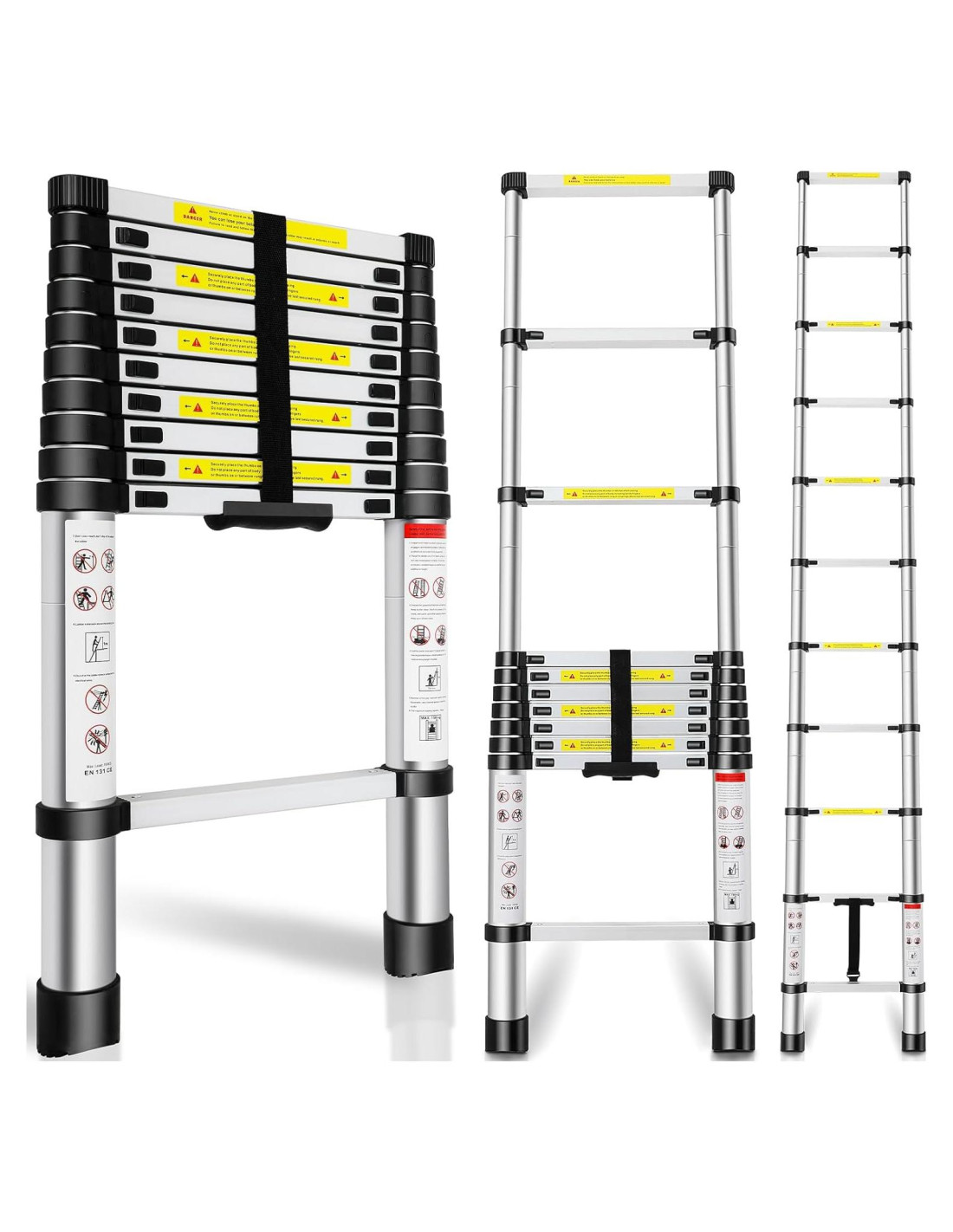 - Segura y Confiable - Cada peldaño de la escalera telescópica de 10.5ft está estriado para aumentar la fricción; bloqueo estable asegura los peldaños, evitando golpes y caídas, pies de goma de alta calidad, fácil de asegurar la escalera telescópica a la pared y al suelo.