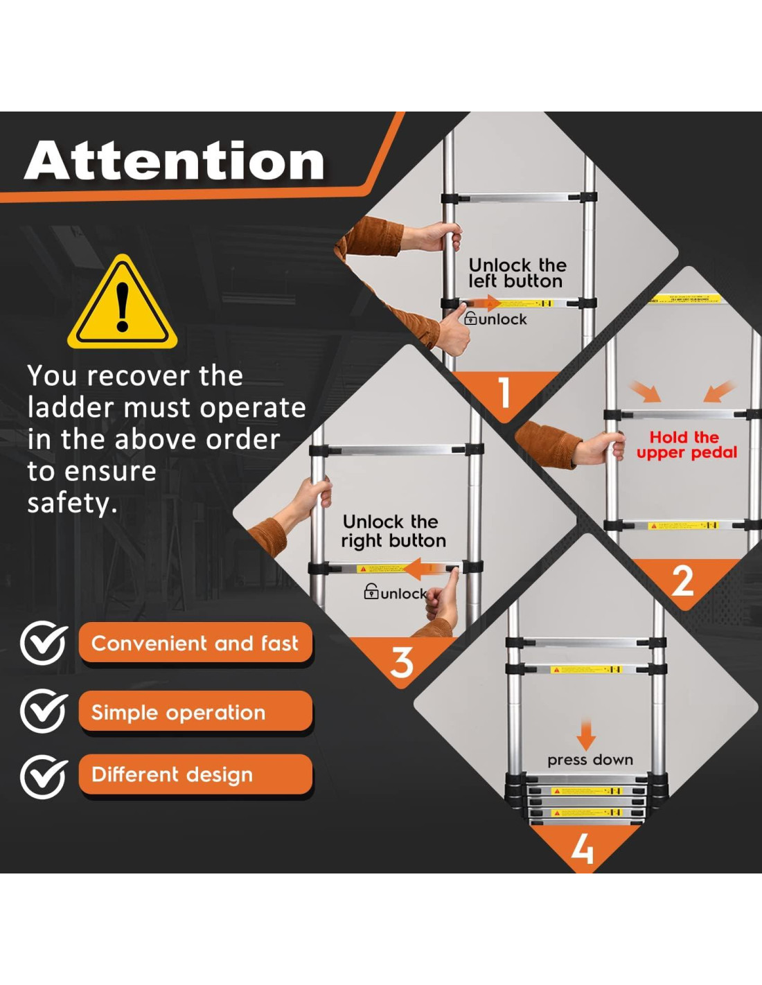 - Seguridad de Uso: La construcción de alta calidad de la escalera telescópica asegura que cada parte se retraiga de manera segura. Los pasadores de bloqueo inteligentes mantienen las partes en su lugar y previenen el deslizamiento, y la escalera se retraerá de manera suave y lenta.