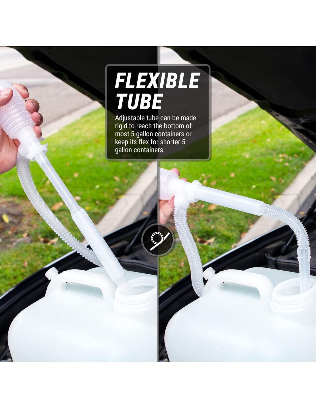 - TUBO DE SUCCIÓN ÚNICO - Longitud de aproximadamente 18.25 pulgadas (46.4 cm), se adapta a latas de gasolina de 3 a 5 Galones, latas Jerry, cubos de 5 Galones y más - Sistema de Tubo de Succión Patentado Flexible para Contenedores Irregulares y Rígido para Contenedores Más Altos - El Tubo de Succión está cortado en un ángulo para quedar plano contra el fondo de los barriles y captar hasta la última gota de combustible