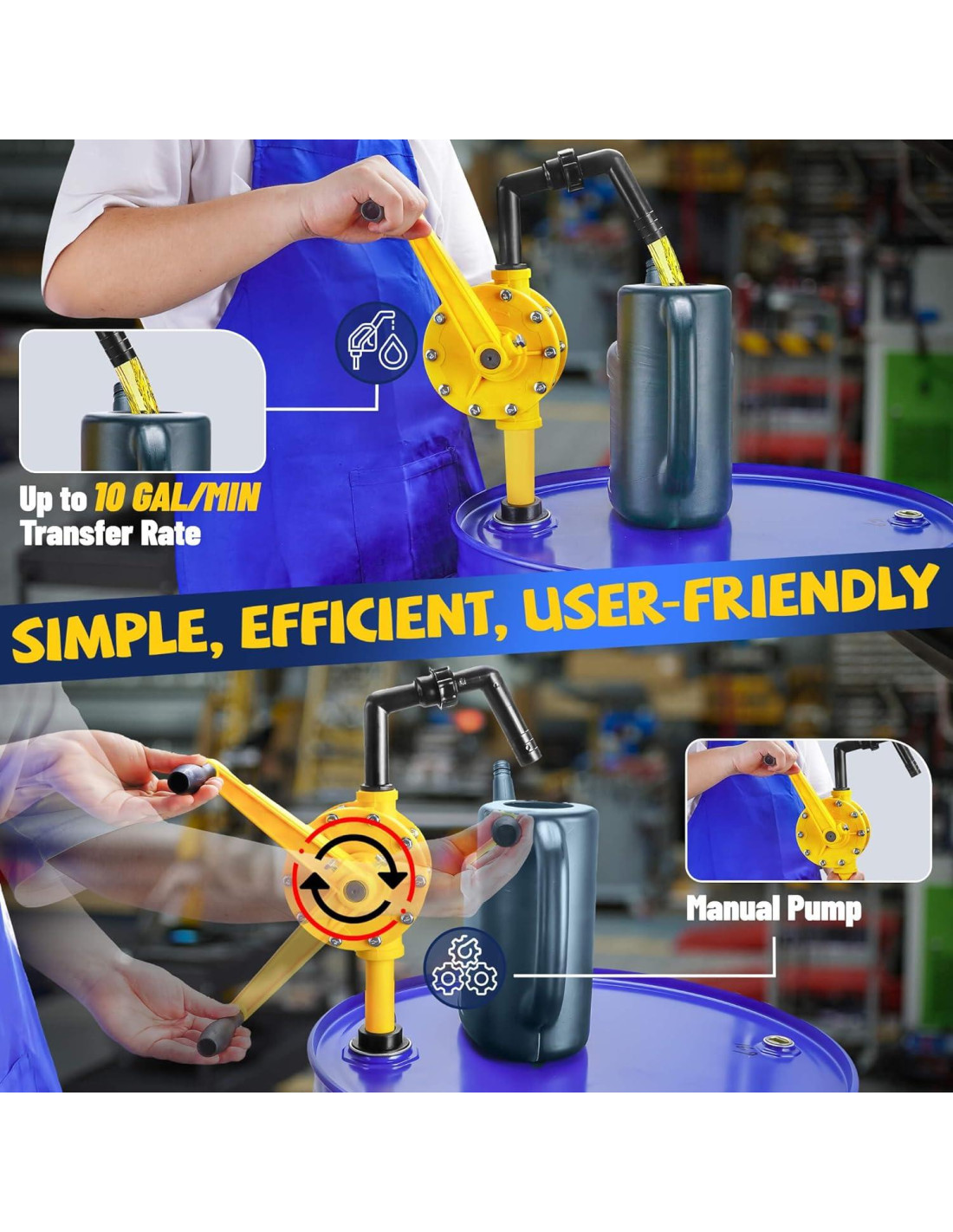 - Bombeo eficiente de tambores: Disfrute de transferencias suaves y eficientes con una impresionante tasa de flujo mínima de 10 Gal/Min. Cada rotación lo acerca a un manejo de fluidos sin problemas. A diferencia de las bombas estándar, nuestro diseño presenta componentes más grandes para un mejor rendimiento, convirtiéndola en la opción confiable para aplicaciones de tambor y asegurando que nunca se pierda un ritmo en su flujo de trabajo.