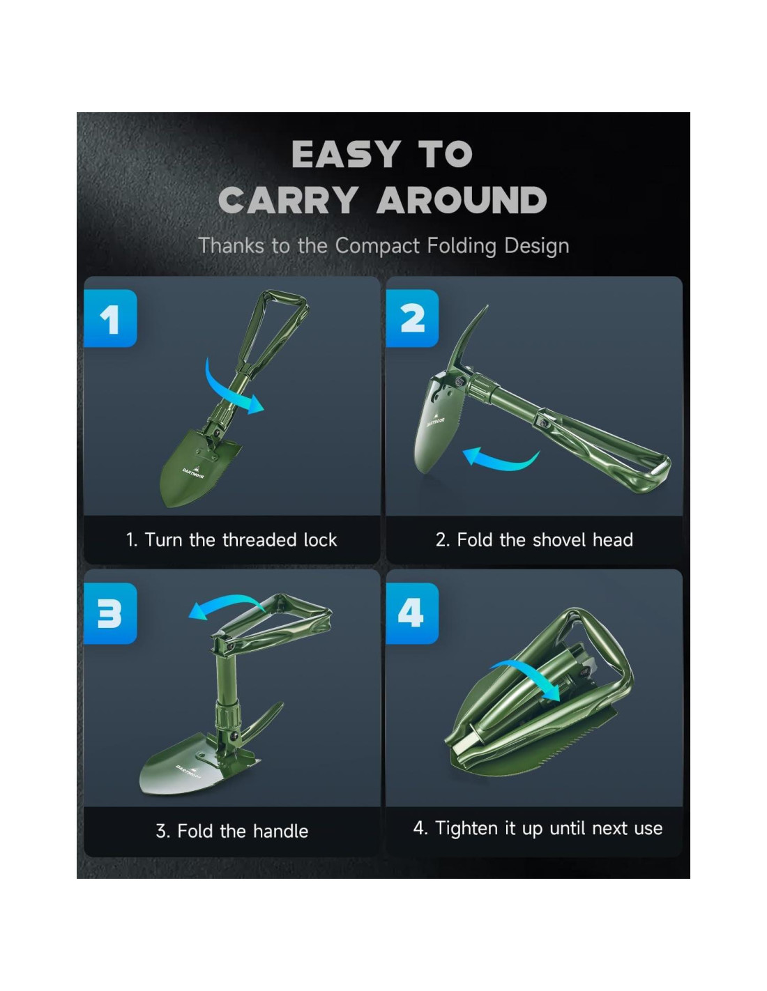 - HOJA DE CORTE ENGROSADA: Gracias a la hoja reforzada, nuestra pala de rescate plegable puede excavar en grava con facilidad, un elemento imprescindible para patios traseros, jardines, tierras agrícolas, campistas, guardabosques y amantes de la naturaleza.