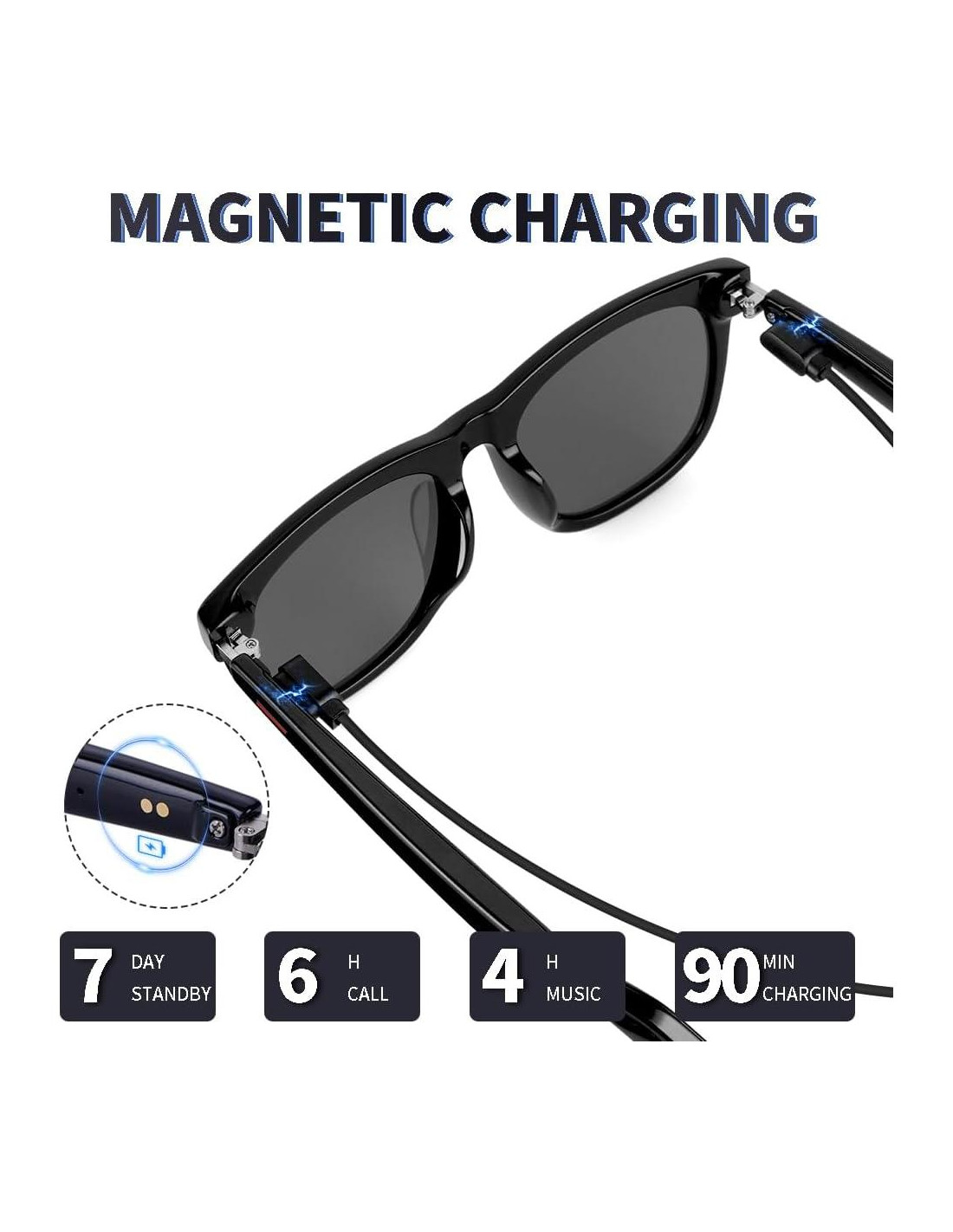 - Suficiente Energía: Hay una batería de gran capacidad de 100mAh en cada lado para proporcionar suficiente energía y asegurar una larga duración de la batería. Las gafas Bluetooth pueden durar aproximadamente 7 días en espera, hablar durante aproximadamente 6 horas y reproducir música durante aproximadamente 4 horas. El método de carga es carga magnética, y tarda aproximadamente 90 minutos en cargarse completamente.