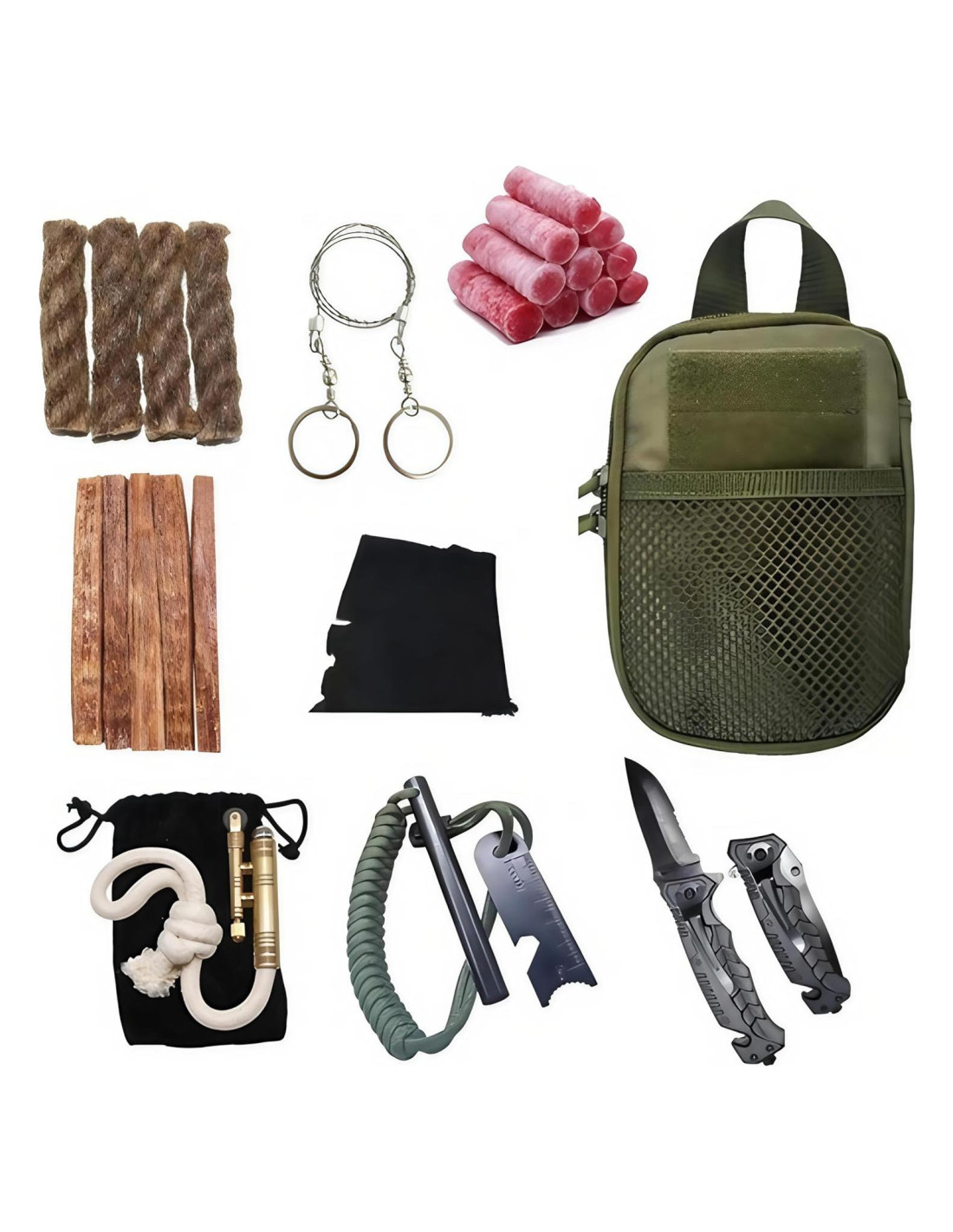 - Componentes incluidos: Bolsa Molle, encendedor de magnesio, golpeador multifuncional, palos de cera, soplador de fuego extensible, palos de cuerda gruesa, sierra de camping de acero inoxidable, piezas de madera cortadas a mano, fósforos a prueba de agua, encendedor de cuerda de rueda de pedernal y tela carbonizada