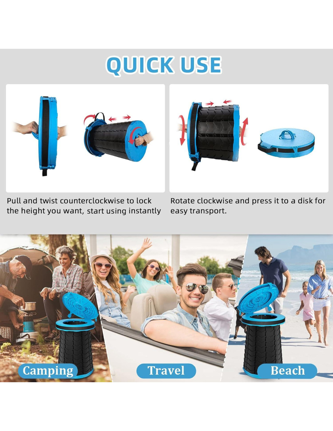 - [Fácil de Usar] El inodoro de camping está diseñado para una instalación rápida y sin esfuerzo. Para abrirlo, simplemente tira y gira en sentido contrario a las agujas del reloj, y estará listo para usar en solo segundos. Su diseño plegable, combinado con una correa de transporte, lo hace extremadamente conveniente para almacenamiento y transporte. Esta facilidad de ensamblaje y portabilidad hace que el inodoro portátil para camping sea una solución ideal para actividades al aire libre, viajes de camping o situaciones de emergencia donde no hay instalaciones tradicionales disponibles.