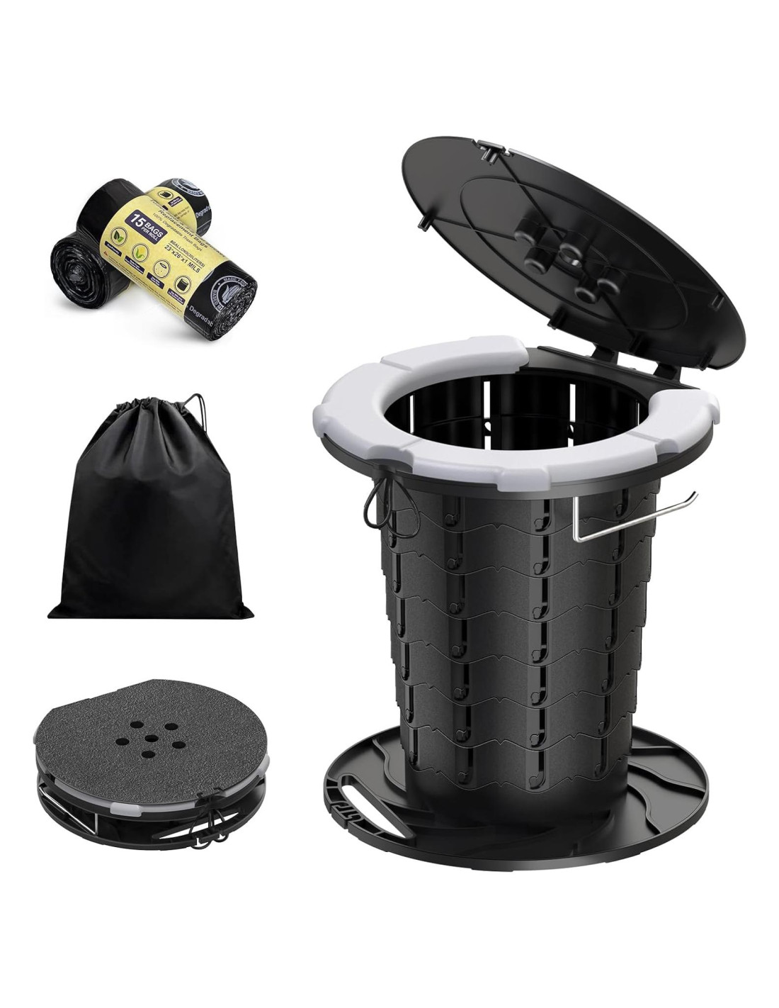 - [MULTIFunciones] Este inodoro portátil plegable para camping con tapa tiene múltiples usos, no solo se puede usar como inodoro portátil para camping, senderismo, viajes largos, atascos de tráfico, viajes, roadtrip, tienda emergente, conductores de camiones y más, también se puede usar como un taburete, cubo de basura, cubo de almacenamiento, cubo de bar, e incluso como un inodoro para niños para practicar su uso. Además, también incluimos una bolsa de almacenamiento impermeable. Conveniente para que la guardes en tu mochila o maletero cuando no esté en uso.