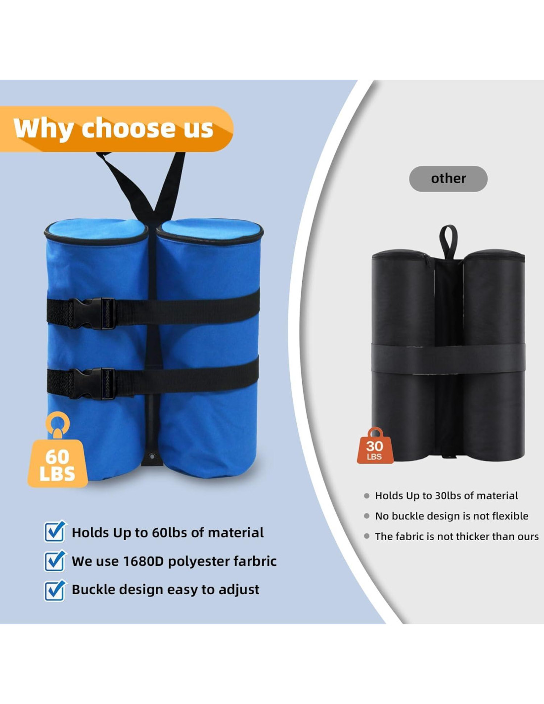 - [Juego de 4 Bolsas con Peso] : Cada bolsa de arena sostiene hasta 60 lbs (27 kg) de arena, rocas, tierra y otros elementos para proporcionar peso adicional en la parte inferior de la carpa y evitar que se vuelque o se vuele en condiciones de viento. (El producto no incluye relleno)