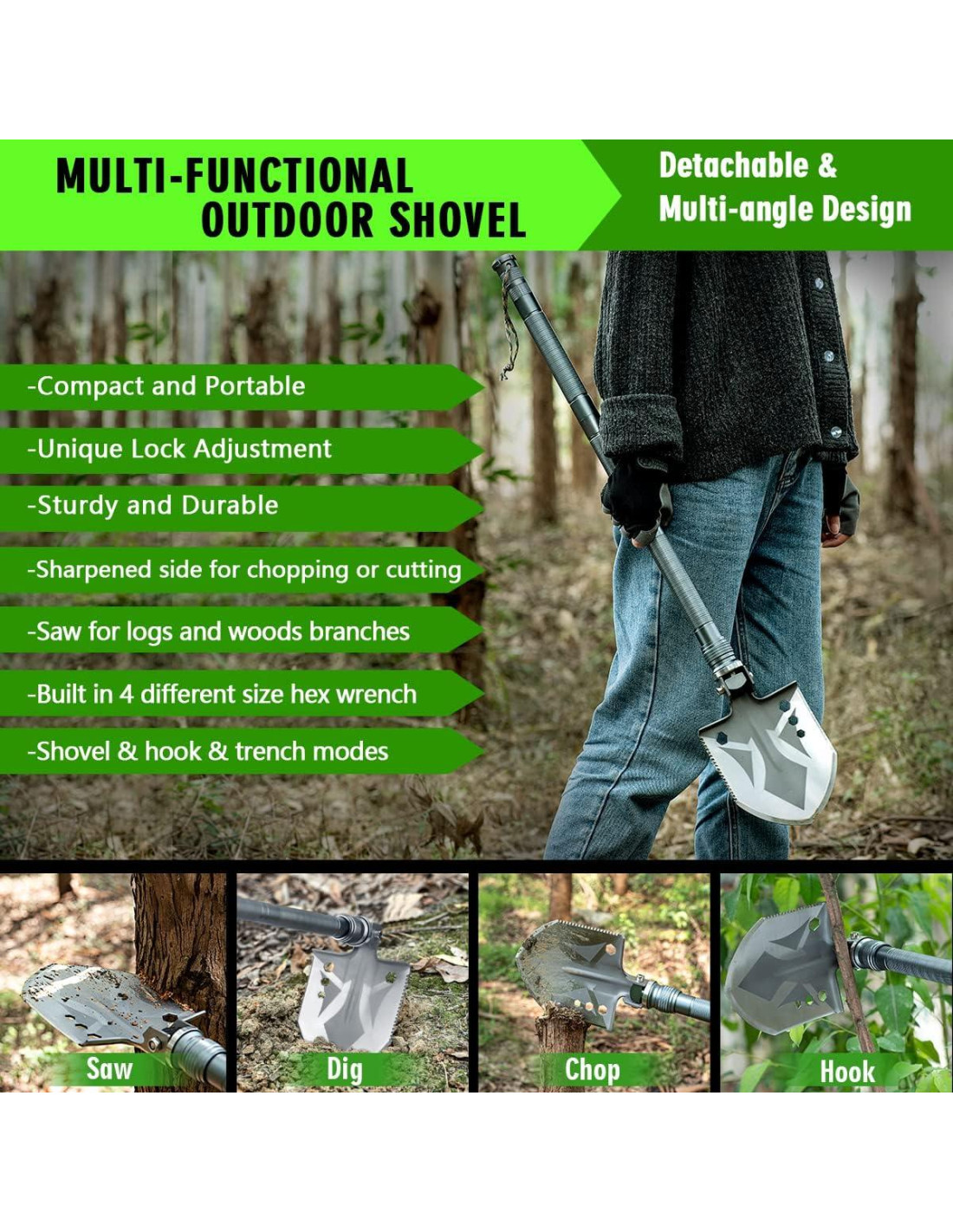 - Multi-herramienta de Entablado Ultra-Compacta: Este conjunto de pala de camping y hacha de supervivencia es la herramienta de supervivencia definitiva que incluye todo lo necesario para sobrevivir al aire libre: Pala, Hacha, Azada, Llave, Sierra, Abrebotellas, Linterna, Multiherramienta, Cuchillo de Caza, Silbato de Emergencia, Martillo de Seguridad, etc. Está diseñado y producido pensando en los entusiastas de los deportes y actividades al aire libre: Off-road, Camping, Senderismo, Mochilero, Pesca, Camping en RV, Senderistas, Cazadores, Pescadores, Jardineros, Supervivientes, Conductores de camiones.