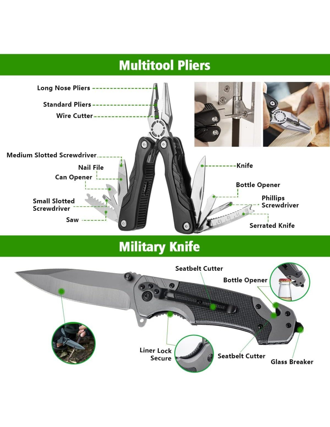- Herramienta de Supervivencia Definitiva en una Caja: Todos los componentes están bien organizados y equilibrados en una funda duradera y ligera. La funda moldeada tiene un diseño lógico y bien distribuido, para ajustar los componentes y prevenir el desplazamiento y la pérdida, previene el óxido y el daño al contenido. La funda de transporte también tiene un mango que añade conveniencia para empacar y llevar contigo. ¡Ahorra mucho espacio!
