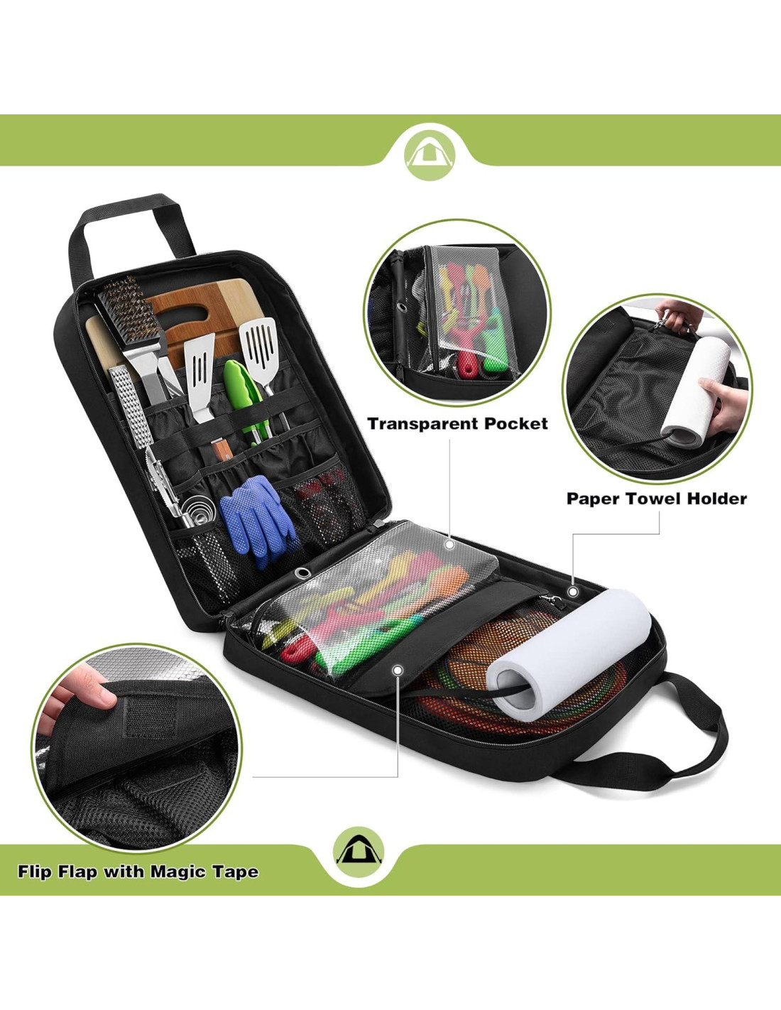 - Parte inferior: La parte inferior tiene un bolsillo elástico con tapa y un bolsillo transparente con cremallera; sus diseños cerrados evitan que los platos y el equipo de cocina se caigan al moverse; el soporte para papel toalla es adecuado para el aire libre