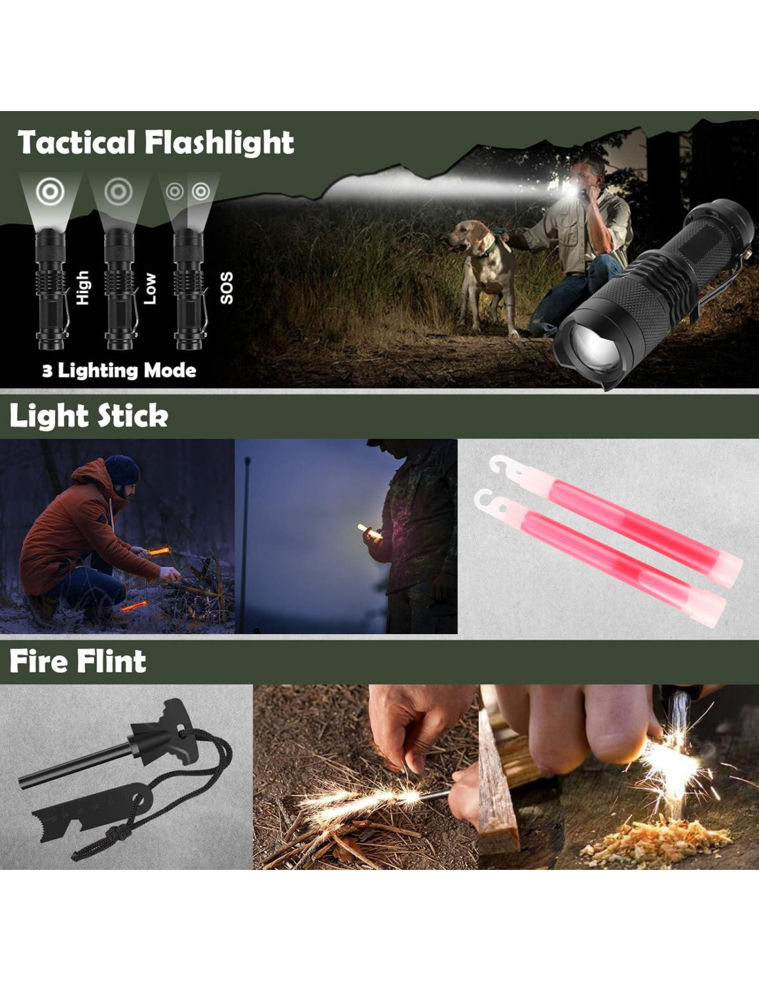 - Equipo y Herramientas de Supervivencia de Alta Calidad para Actividades al Aire Libre. Todas las herramientas de supervivencia y suministros médicos dentro del kit están hechas de material duradero y de calidad premium. Perfecto para viajar, cazar, acampar, hacer senderismo, andar en bicicleta de montaña, mochilear. Este kit de supervivencia también es una gran preparación para emergencias ante desastres naturales como terremotos, huracanes, inundaciones.