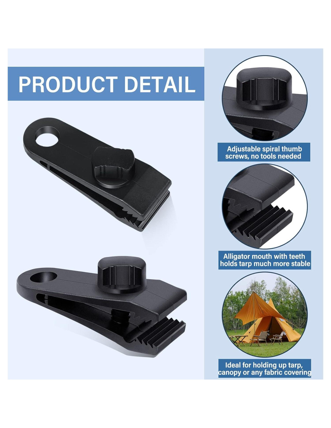 - [Sujetadores de Lona de Alta Resistencia] --- Estos sujetadores de tienda tipo tornillo están diseñados con tornillos de pulgar en espiral ajustables para apretar la mandíbula y proporcionar una fuerte capacidad de agarre en tu lona. Perfecto para asegurar una vela de sol, una caravana emergente o una lona.