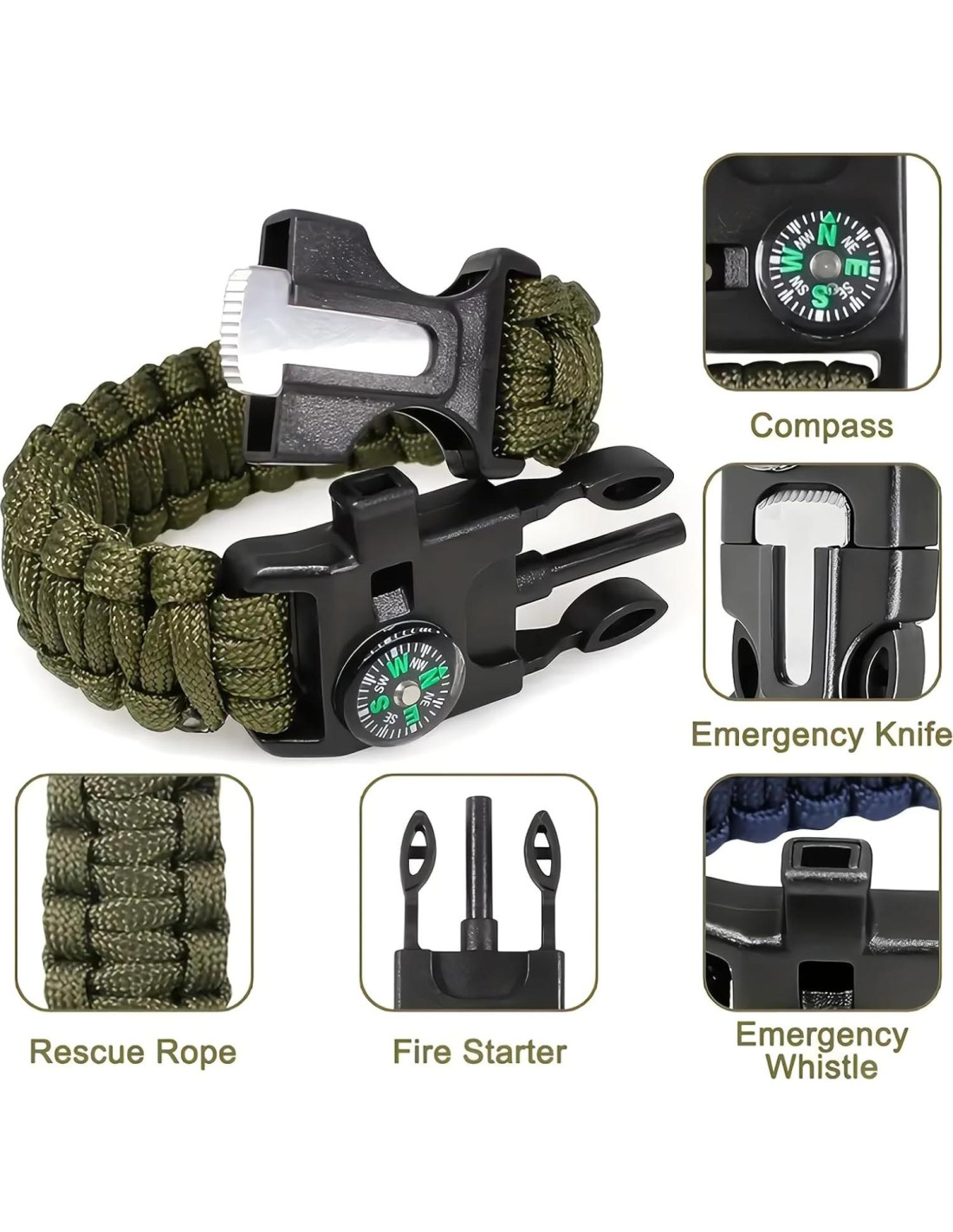 - Componentes incluidos: Cerillas a prueba de agua, cuchillo, sierra de alambre, herramienta multifuncional, mosquetón en forma de D, manta de emergencia, cuerda encerada, pulsera de paracord