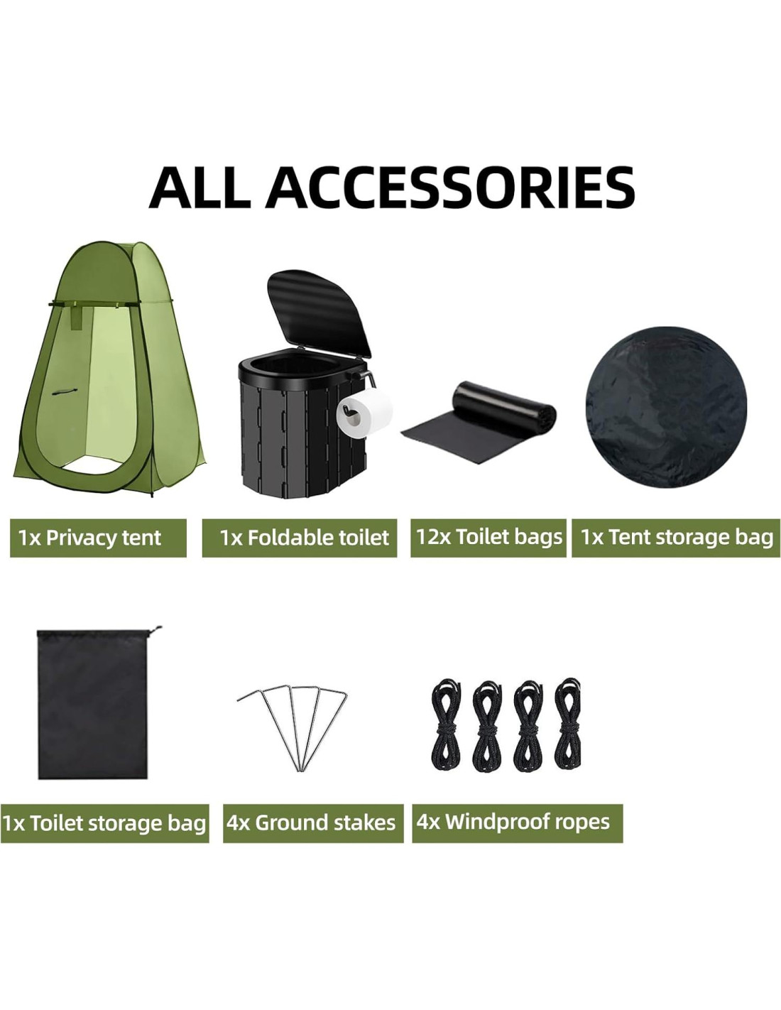 - [Totalmente equipado] Este kit de inodoro de viaje incluye 1 tienda emergente, 1 inodoro plegable, 12 bolsas de inodoro, 1 bolsa de almacenamiento de tienda, 1 bolsa de almacenamiento de inodoro, 4 estacas para el suelo y 4 cuerdas a prueba de viento. Tenemos todos los accesorios de instalación.