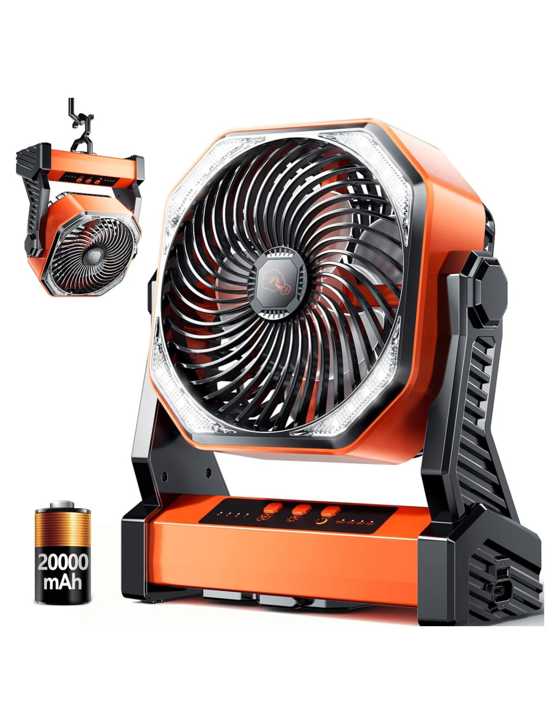 - Fácil de usar, el ventilador y las luces LED se controlan por separado. Las luces de 4 velocidades y las luces de batería de 4 muestran tu configuración actual de velocidad del ventilador y la capacidad restante de la batería. Presiona el botón de modo de sueño para apagar las luces cuando duermes y no quieres que se enciendan. La parte inferior tiene una mesa giratoria de 360 y ganchos plegables para colgar el ventilador de tienda donde quieras.