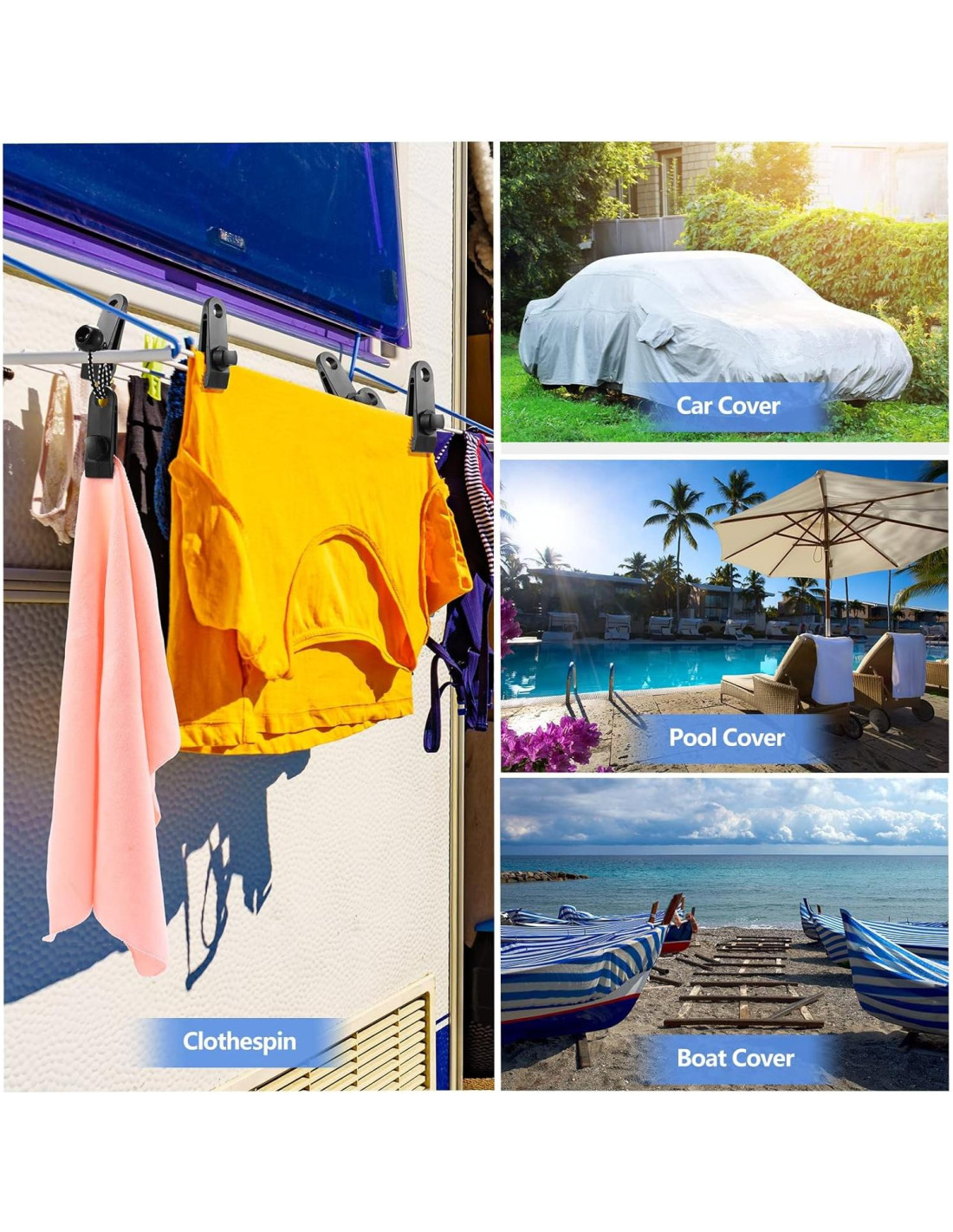 - Amplia Aplicación: este conjunto multipropósito de cuerdas bungee y clips de lona es ideal para tiendas de campaña al aire libre, toldos, caravanas, lonas, lienzo, refugios temporales, viseras solares, pantallas de proyector temporales, cubiertas de sofá y cubiertas de barbacoa