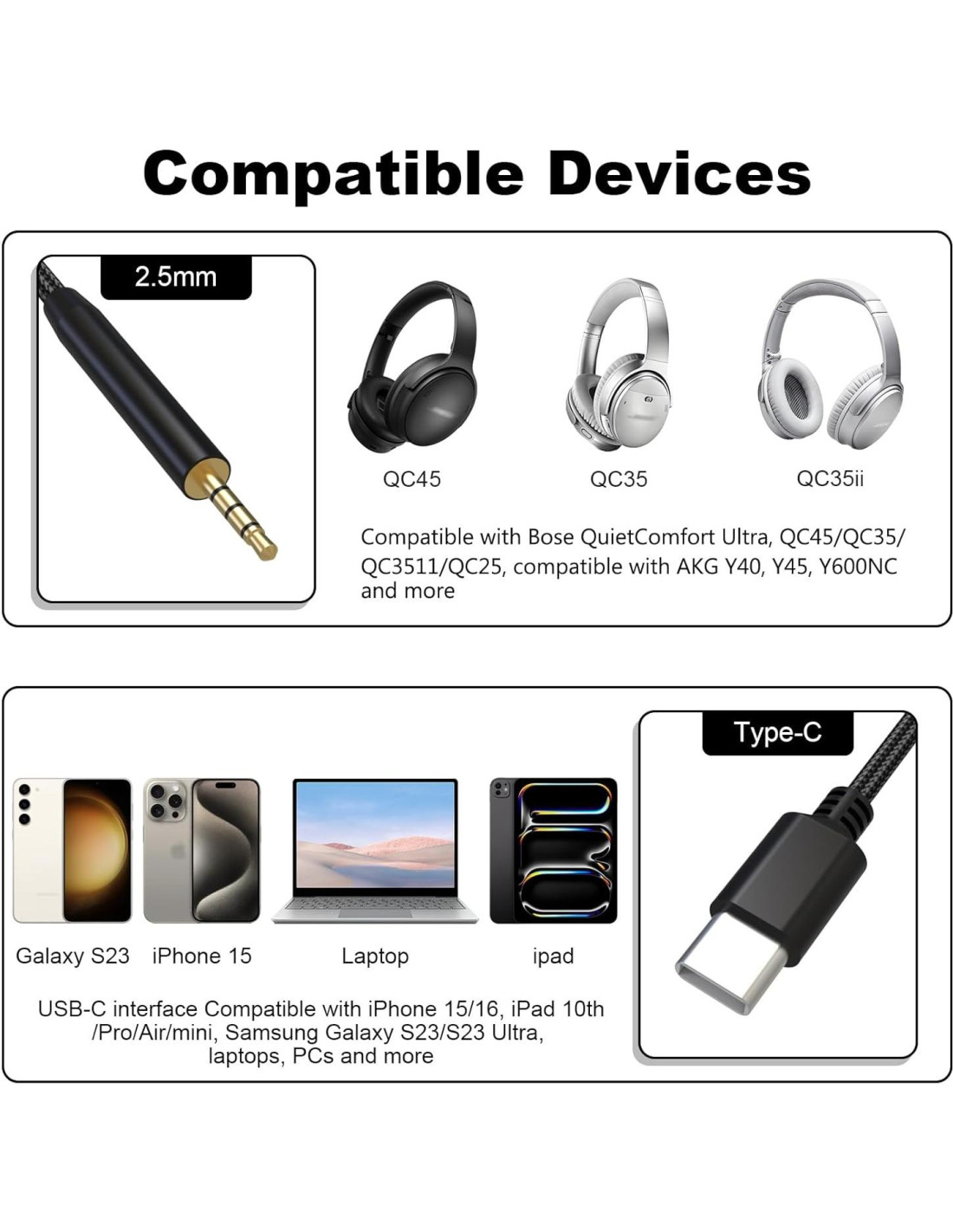 - Modelos compatibles: El cable de audio USB-C a 2.5mm es compatible con Bose 700, QuietComfort Ultra, auriculares Bluetooth QuietComfort, QC SE, QC45/QC35/QC35II/QC25, auriculares SoundLink II, también compatible con Tune 770NC/760NC/720BT, E45BT/E55BT/E65BTNC, reemplazo para AKG Y40, Y45, Y45BT, Y50, Y50BT y otros auriculares con conector de 2.5mm. Este cable puede reemplazar cables dañados o perdidos. Para una lista detallada de modelos compatibles, consulte la lista de compatibilidad a continuación.