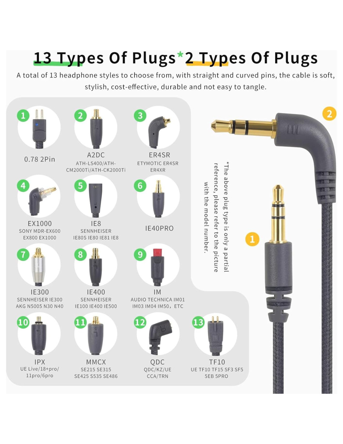 - Con una amplia selección de 13 tipos de conectores, incluyendo 3.5mm, MMCX y 0.78mm de 2 pines, este cable ofrece una amplia compatibilidad con los principales reproductores de audio y auriculares de alta fidelidad. Elige entre conectores rectos y en ángulo recto para que se ajusten cómodamente a tu dispositivo y reduzcan la tensión durante su uso.