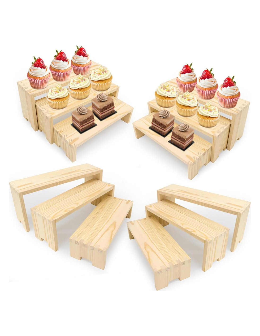 - Diseño en Capas: Estos elegantes soportes de madera están diseñados para exhibir joyería, cupcakes, manualidades, figuras de acción y más. Vienen en varias dimensiones prácticas para acomodar diferentes tamaños.