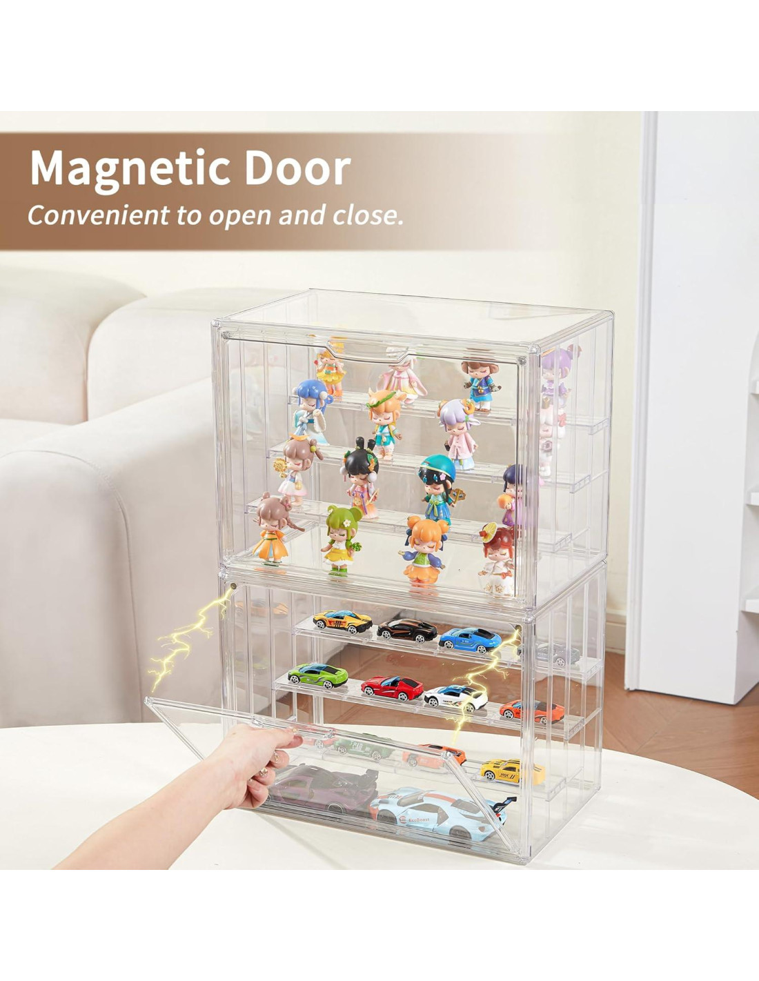 - Puerta Magnética: Nuestras cajas de exhibición para coleccionables cuentan con un diseño de succión magnética, asegurando una apertura y cierre sin esfuerzo. Esto te permite recuperar convenientemente tus figuras de la caja de exhibición de acrílico transparente siempre que lo desees