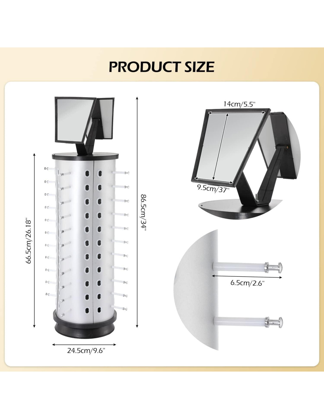 - Tamaño del Material: El soporte de exhibición de gafas de sol rotativo de 360 con espejo está hecho de material de aluminio+plástico+espejo. El aluminio es más duradero que el plástico y el cuero. No se oxidará ni se desvanecerá. La pista de rodillos en la base es firme, estable y suave. Nuestros marcos de gafas giratorios cilíndricos tienen 87cm (34.2") de altura y 24cm (9.4") de diámetro
