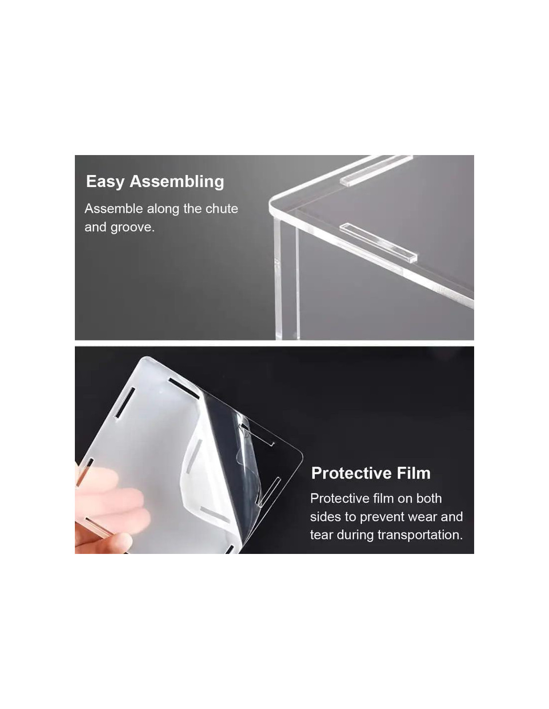 - Acrílico de alta calidad: Esta caja de exhibición está hecha de placas de acrílico de 3mm. Mientras asegura firmeza, también mantiene más del 98% de transparencia. Nota: hay películas protectoras en las placas de acrílico. Debes quitarlas al ensamblar la caja de exhibición
