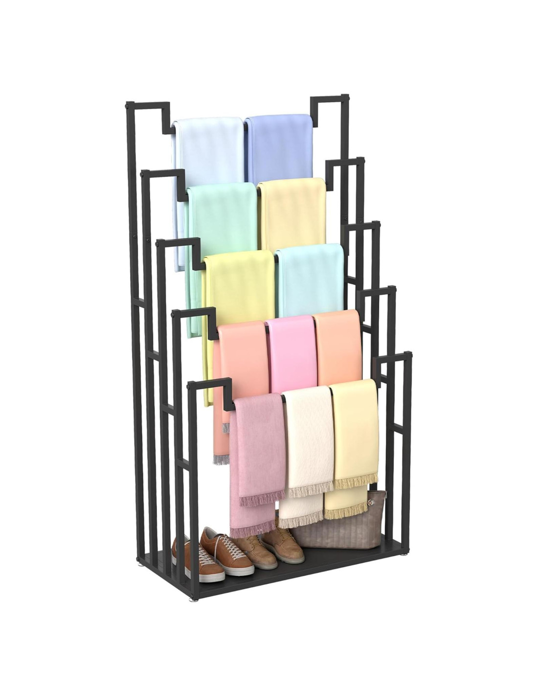 - Ordenado y organizado: Este estante de exhibición de bufandas independiente tiene 5 niveles con gran espacio de almacenamiento, este estante mantiene tus toallas, bufandas, ropa, chales, mantas y pantalones organizados. El diseño en niveles no solo aumenta la capacidad de exhibición, sino que también mantiene los artículos ordenados, visibles y fáciles de tomar y usar, ideal para espacios comerciales, boutiques, tiendas de ropa, uso en casa y al por menor