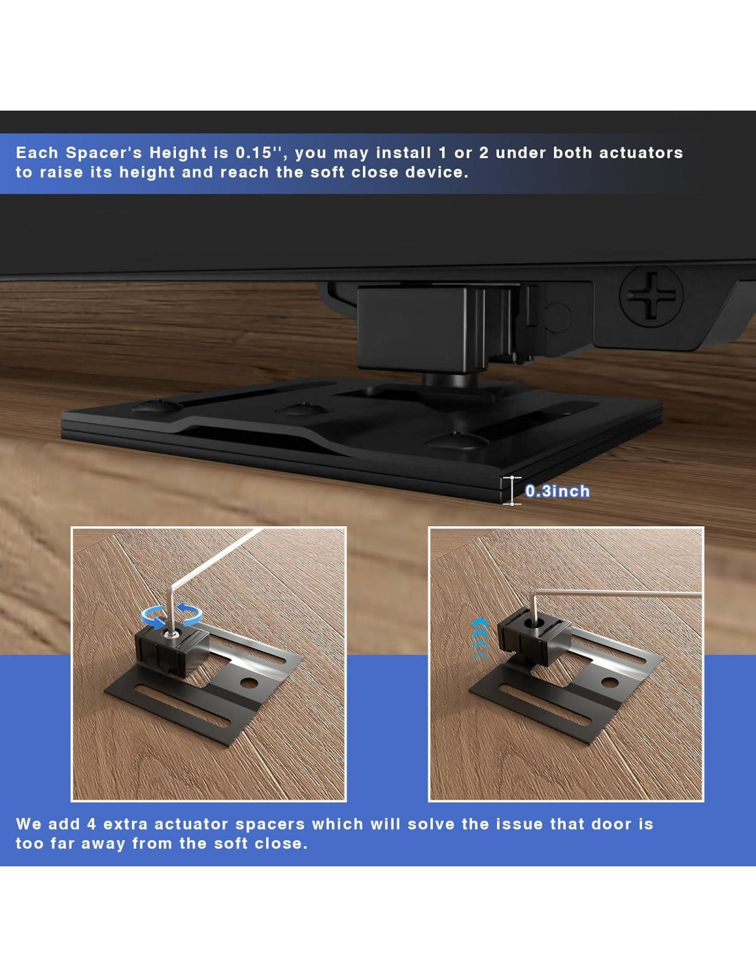 - Lo que nos hace diferentes: Agregamos 4 espaciadores adicionales para actuadores que resolverán el problema de que la puerta está demasiado lejos del cierre suave. La Altura de cada Espaciador es de 0.38cm, puede instalar 1 o 2 debajo de ambos actuadores para elevar su altura y alcanzar el dispositivo de cierre suave. El Actuador Mejorado proporciona un agarre más estable con el cierre suave al abrir o cerrar puertas.