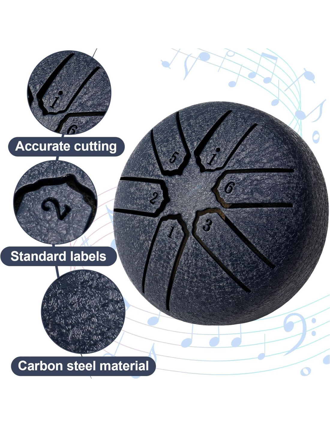 - Un Sonido Más Etéreo: El tambor de acero de 3 pulgadas (7,62 cm) con 6 notas. El sonido de diferentes ritmos se produce por la vibración circular del aire y el cuerpo del tambor. El sonido reverbera a través del aire y dura más tiempo y es más etéreo que los ecos de otros instrumentos, dejándote con una sensación de relajación y placer desde dentro