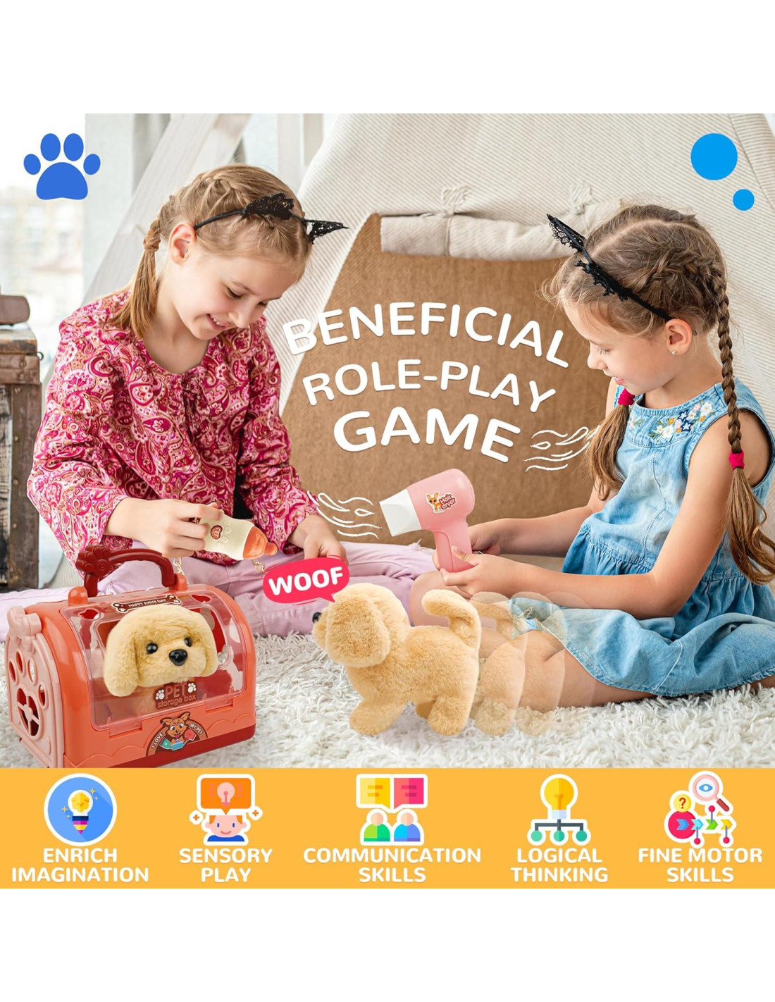 - Juego de Animales de Peluche de Cachorro - El juego de cuidado de mascotas viene con ricos accesorios, incluyendo un perro eléctrico de peluche, una jaula de perro rosa, un peine, un gel de ducha, una máquina de cortar pelo, un secador de pelo, un perfume para mascotas, unas tijeras y una botella para mascotas, permitiendo a los niños experimentar el cuidado, la alimentación, el baño y otras actividades para sus mascotas. El juego de rol puede ayudar a los niños a desarrollar un sentido de responsabilidad, imaginación y habilidades sociales.