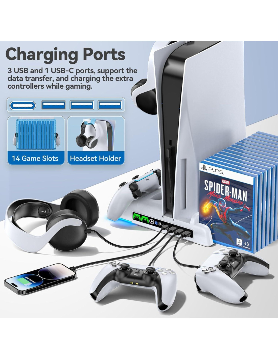 - Fácil de usar y Excelente Gestión del Espacio: El muelle de carga PS5 con ventiladores de enfriamiento eficientes y cargador dual PS5, ventilador de enfriamiento ps5 slim, luces LED indicadoras de carga. Acomoda 14 discos de juegos ps5, auriculares ps5 inalámbricos, almacenamiento de tornillos, adaptador ps5 slim, control remoto multimedia ps5, disco duro externo ps5, sistema de enfriamiento ps5 todo en uno soporte playstation 5, manteniendo todos los accesorios de playstation 5 ordenados y organizados, haciendo de esta estación de enfriamiento PS5 un mejor reemplazo para la estación de carga oficial PS5 de sony. Grandes accesorios de juego ps5 para hombres.